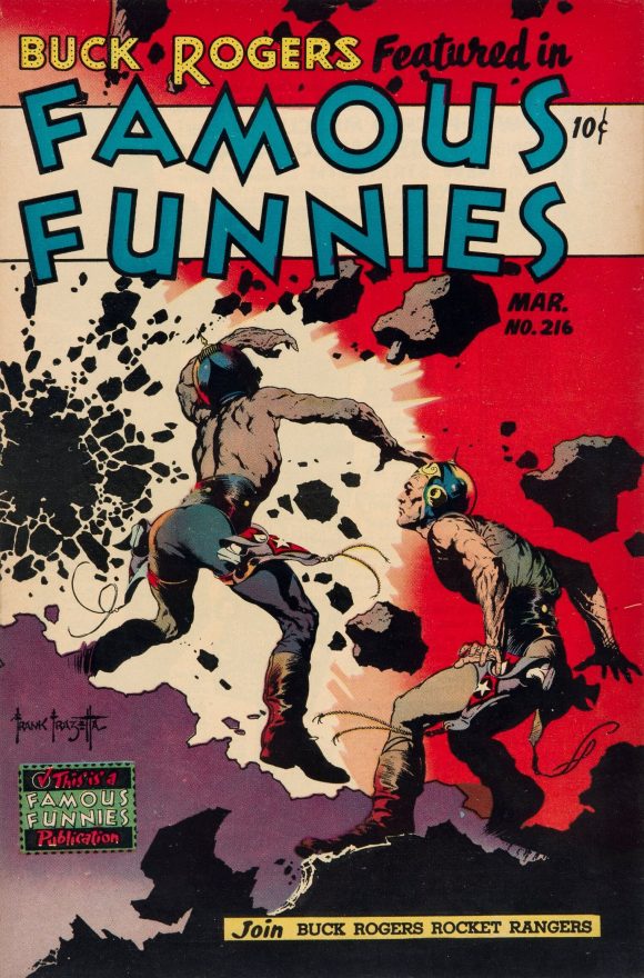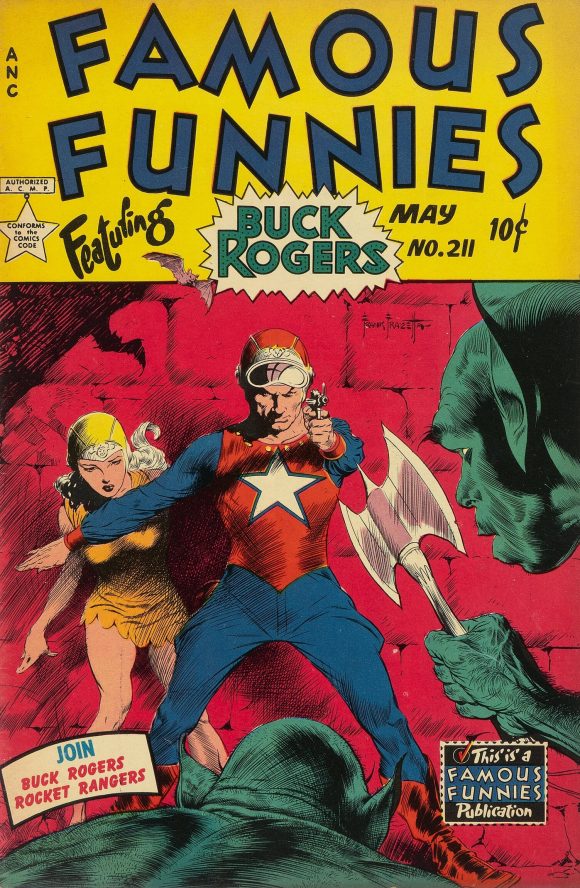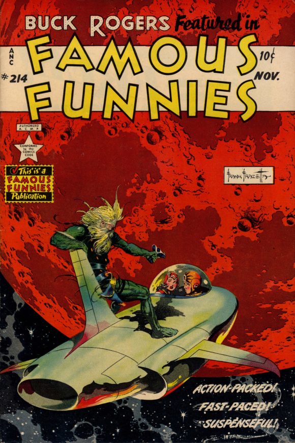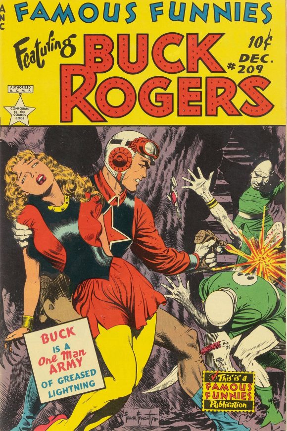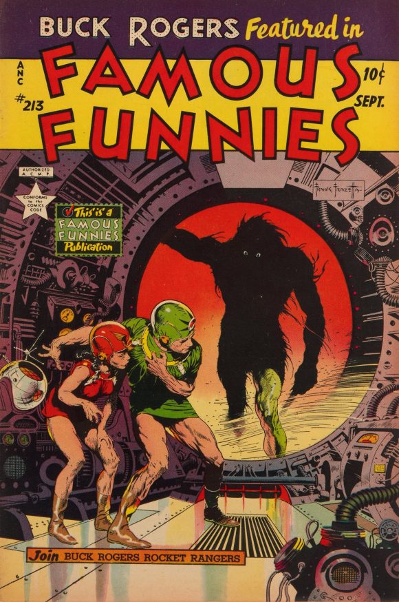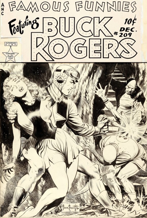 Image from Russ Cochran’s 1972 limited print run with new Frazetta coloring for each print. This was originally meant to be another Buck Rogers cover for Famous Funnies but it was rejected for too much violence. The helmet for Rogers was eliminated when it became the cover for Weird Science-Fantasy #29, but was restored for this print.