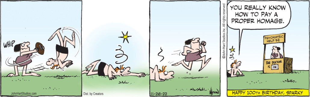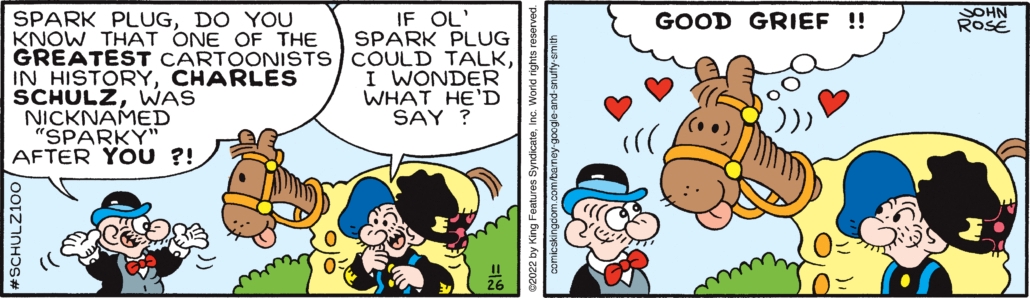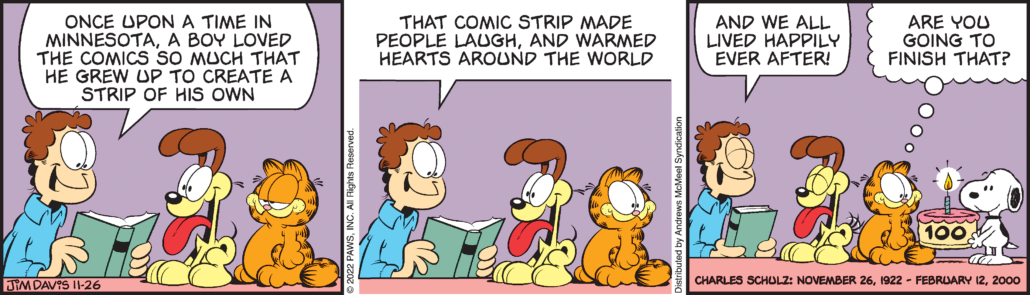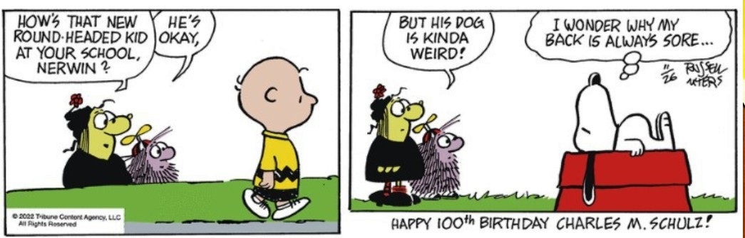 Two decades later, on November 26, 2022 – the 100th anniversary of Schulz’s birth – more than 75 artists and writers paid tribute to Schulz and Peanuts within their own comic strips (over 100 illustrations). The project was the work of Patrick McDonnell, creator of Mutts, and Robb Armstrong, creator of JumpStart.