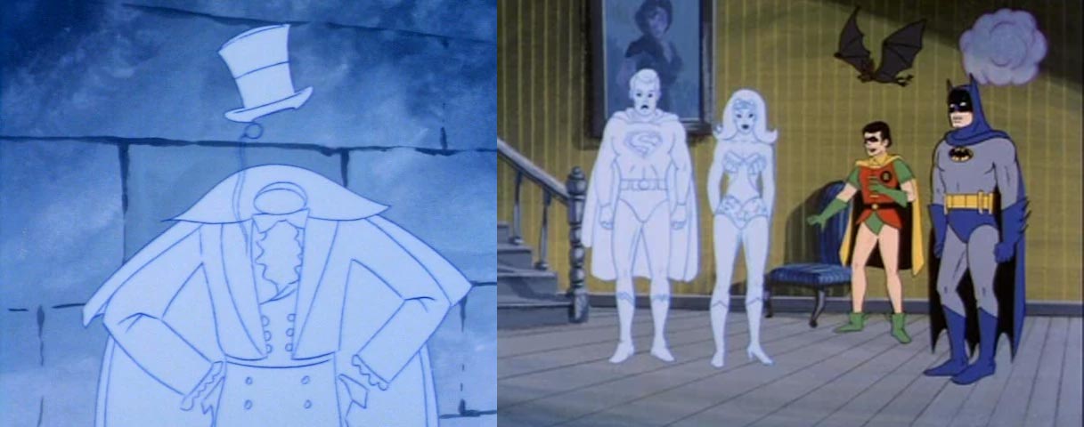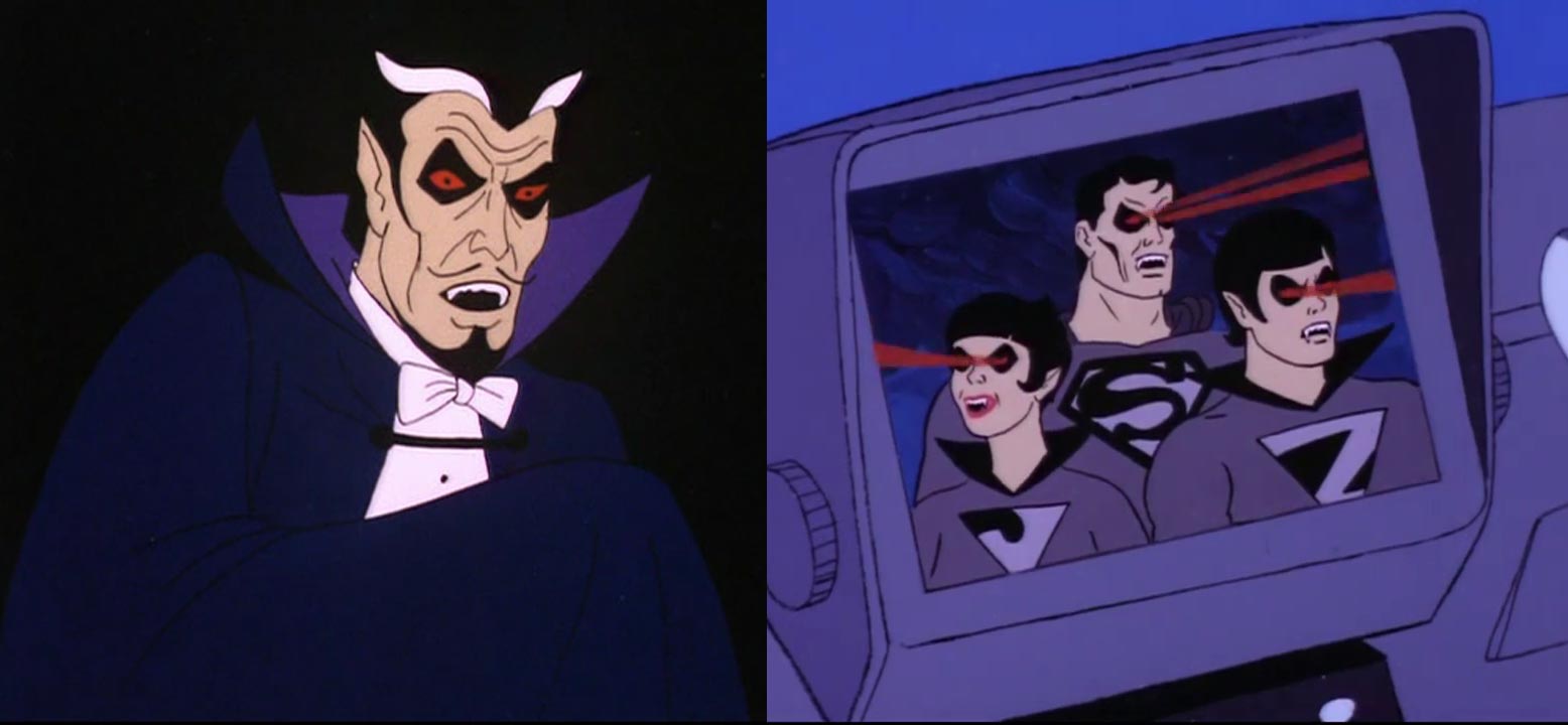 The Super-Vampire creates a lot of havoc and even more minions before the other heroes figure out a way to reverse the curse. The vampire Superman, clad in shades of gray, with darkened, red eyes looks toward a similar design in the next season, and he’s legitimately frightening. Even more disturbing is the show’s take on Dracula, who has an unsettling, almost asthmatic sound, deeply breathing and gasping between each line delivered in his raspy voice. Since network standards wouldn’t allow bites and blood, the vampires are created by magic dust and laser eyes, but the scenes of common people turned into mindless monsters are no less chilling.