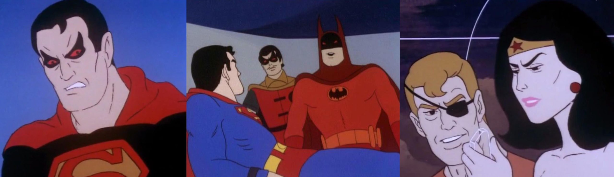 Like that episode, there is a swapping of good and evil, with our Superman sent to the aforementioned “Universe of Evil,” and the evil Superman coming to our world to wreak havoc. Highlights are the designs of the Super-Enemies: Batman all in hues of red with longer ears; Robin with goatee and pencil-thin mustache; haggard looking, darker garbed Wonder Woman; Aquaman with an eyepatch; Superman, clad in black instead of blue, with permanent red eyes and Alice Cooper make-up around them!