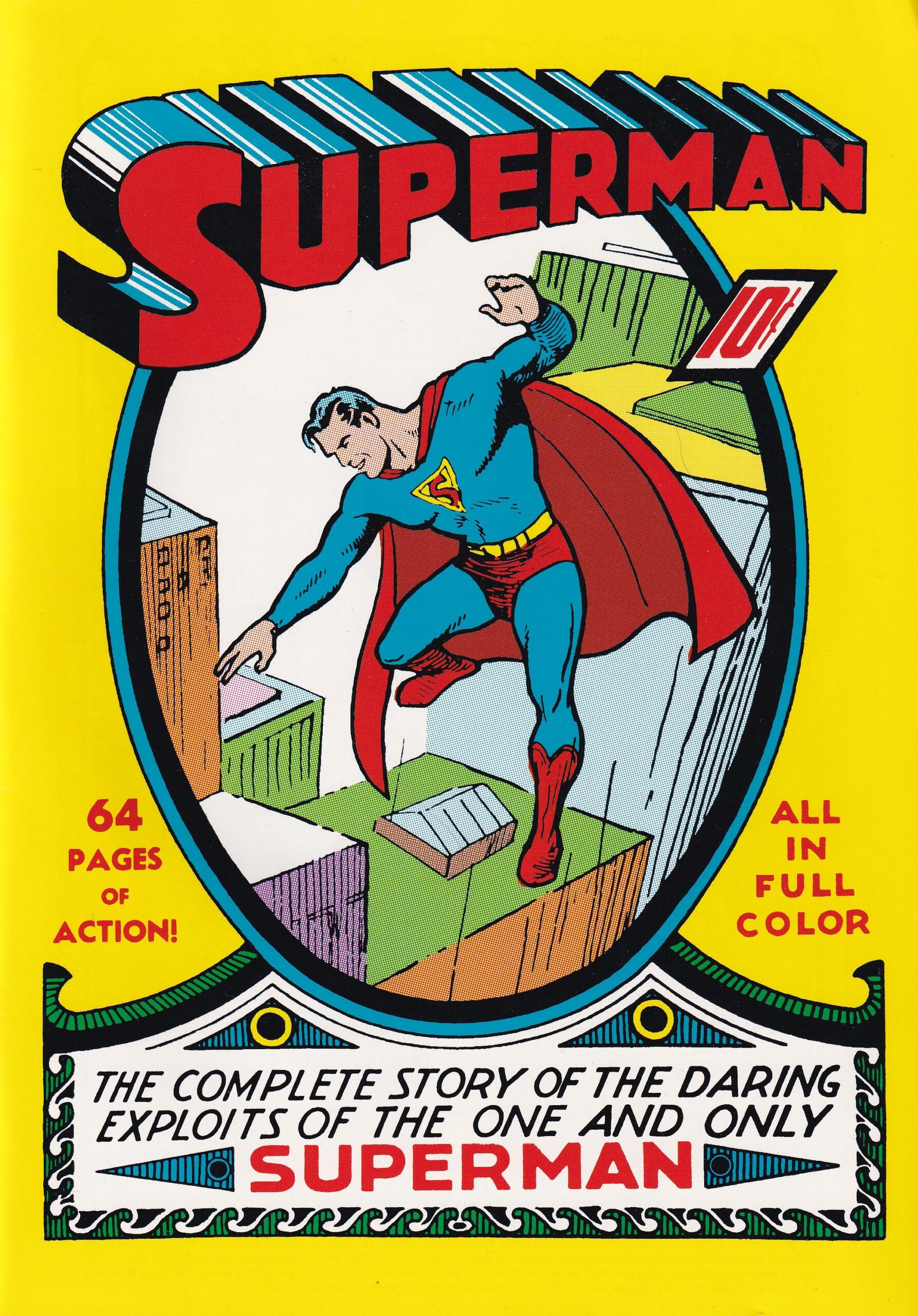 The cover was based on a drawing by Joe Shuster used in Action Comics #10 but the cover here may have been put together by Leo O’Mealia.
