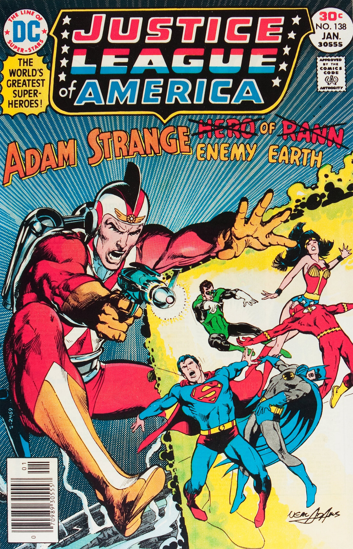 Justice League of America #138 (Jan. 1977). In the mid-1970s Neal took a break from doing covers for DC. So, when he began to do more, it was a happy occasion. Neal’s style was evolving, there were subtle differences. Of all those “later” covers, this one is probably my favorite. The figure of Adam Strange is fantastic, and I love the inking on him, and the planet below.