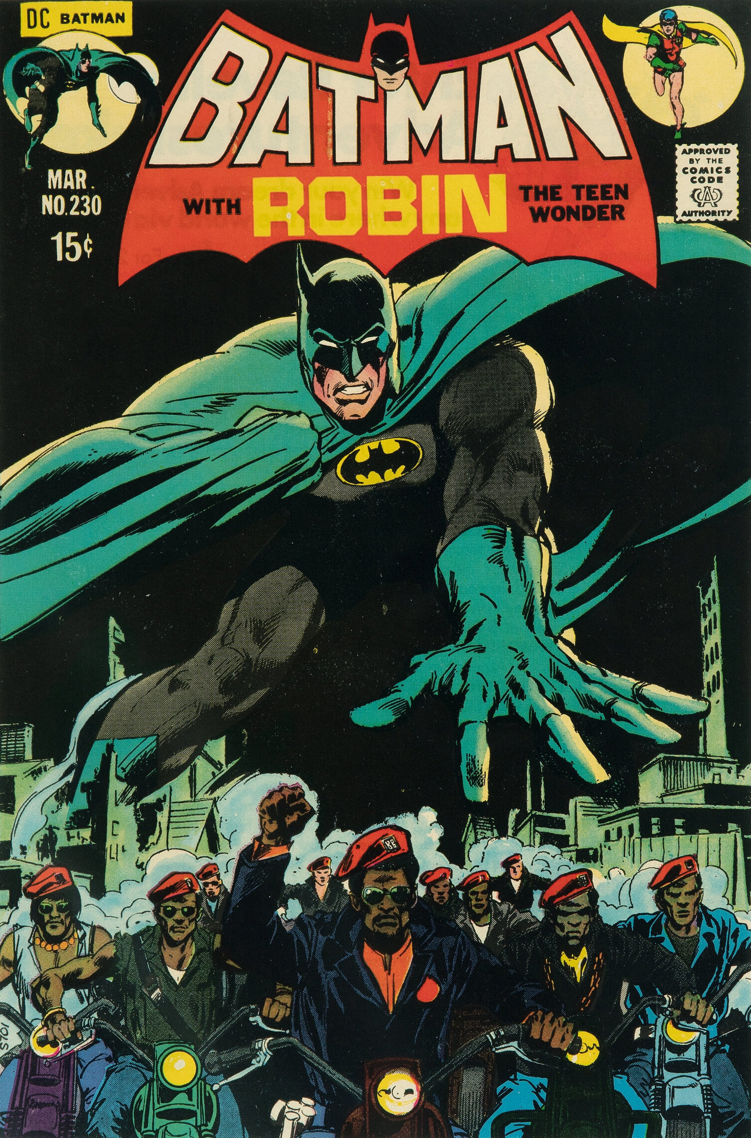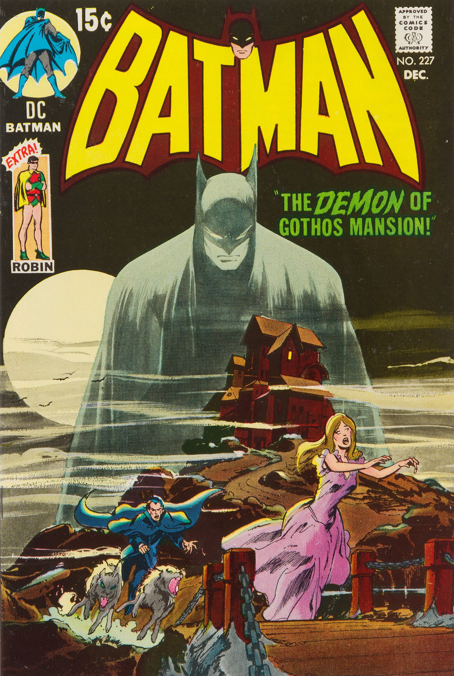 Batman #227 (Dec. 1970). Another wash image. It’s based on the Bob Kane cover of Detective Comics #31 (the third Batman cover) from 1939. In this case, Neal uses the wash to give depth to the foreground. It’s eerie and heroic. A superb cover, one of Neal’s finest.