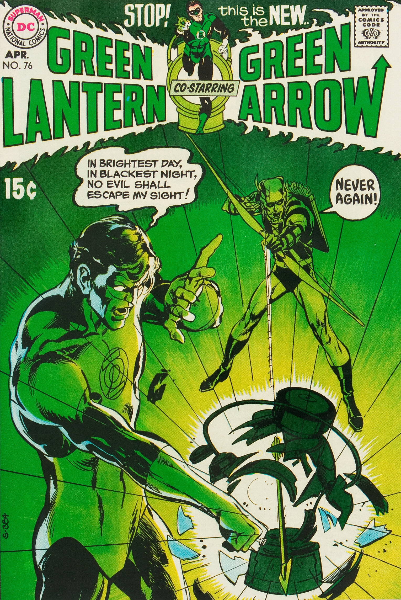 Green Lantern #76 (April 1970). One of Neal’s most important covers, and beautifully designed. The first team-up of Green Lantern and Green Arrow. This was comics at their apex for me as a kid.