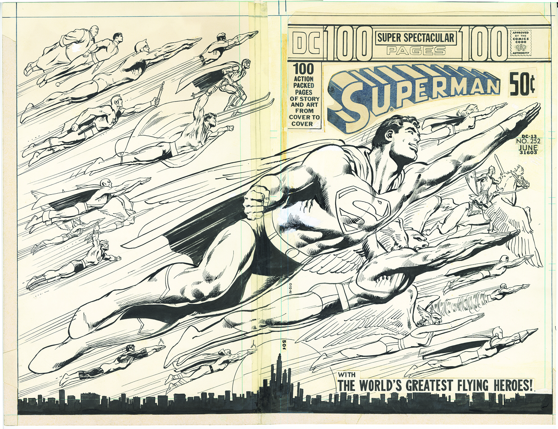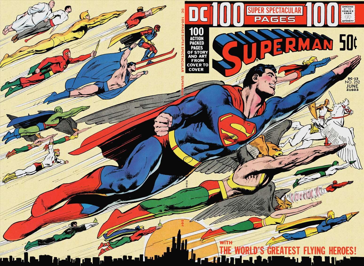 Superman #252 (June 1972). The “flying heroes” cover. This one is so easy to visualize, one of Neal’s most iconic images. I wonder how many sheets, pillow cases, shirts, used that superman figure?