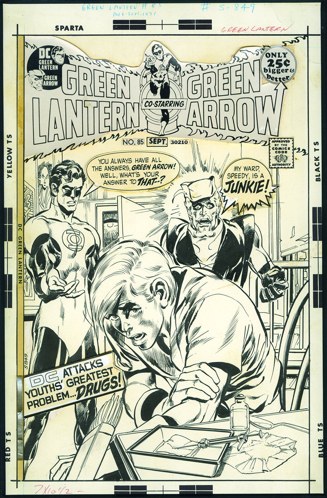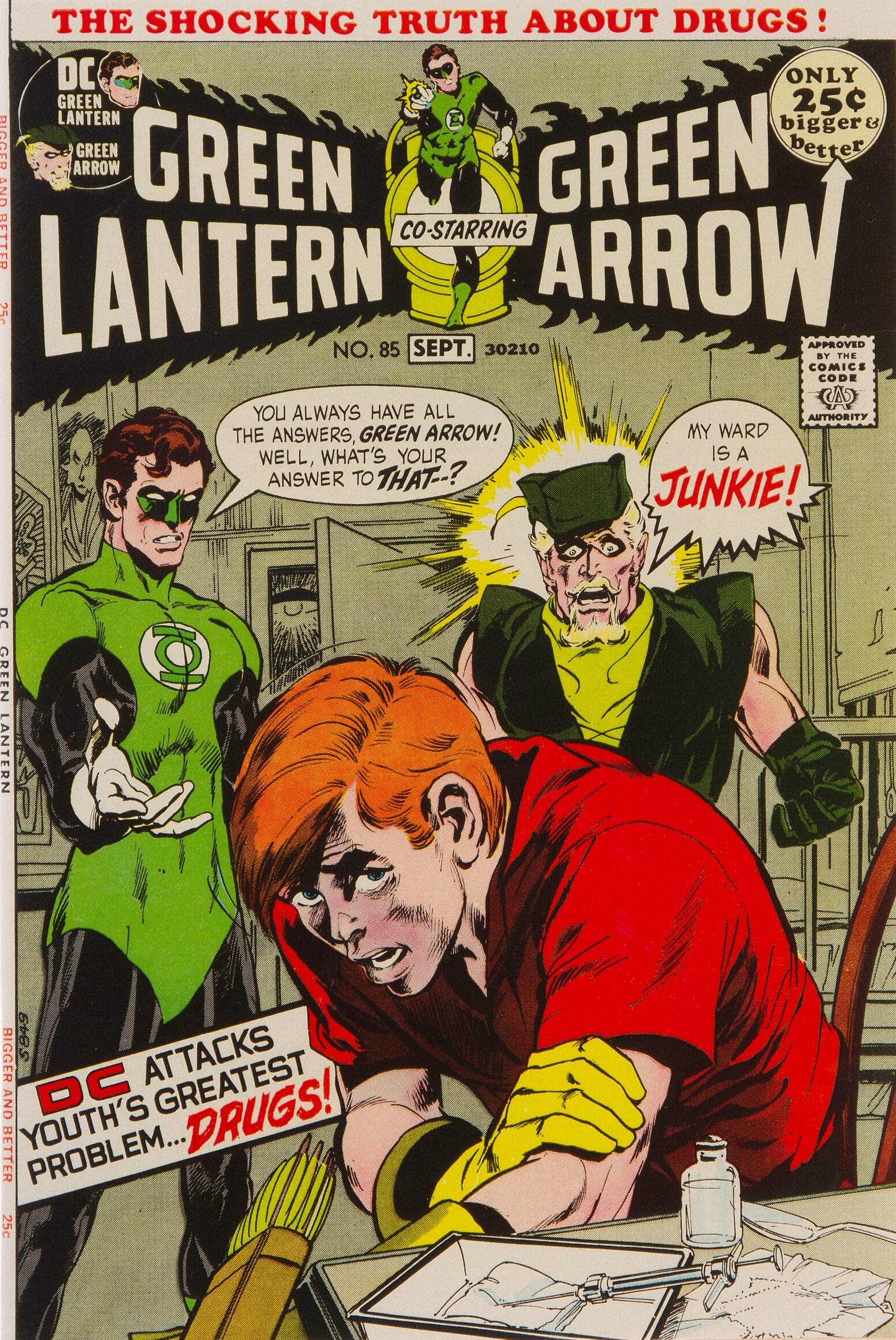 Green Lantern #85 (Aug.-Sept. 1971). It may not seem like so big a deal now, but this was truly shocking when it came out. Compare Green Arrow’s word balloon in the original to the published cover. Maybe they thought “Speedy” was redundant for a drug addict?