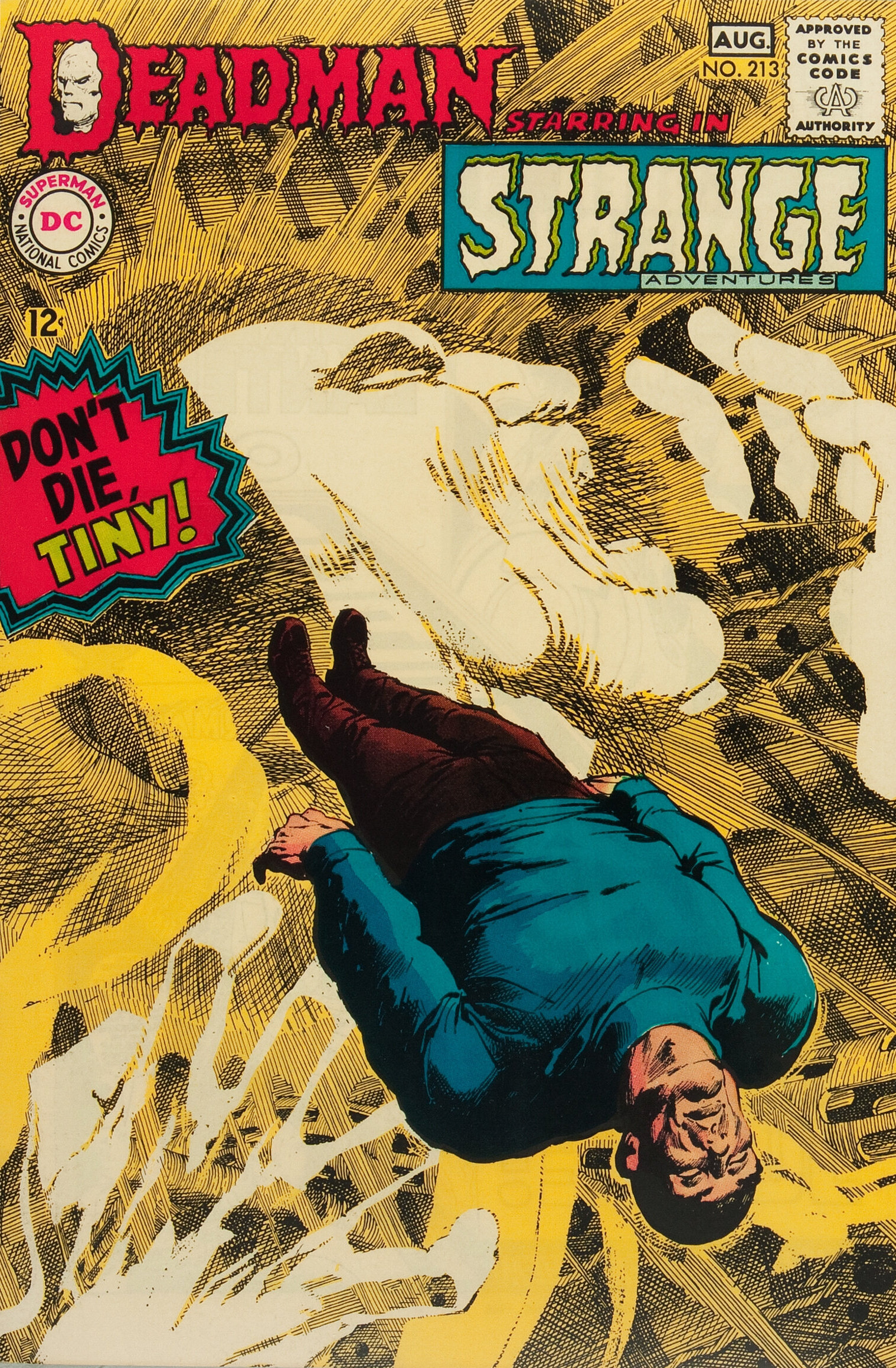 Strange Adventures #213 (July-Aug. 1968). Deadman at his best. Tiny floating in limbo between life and death. The figure is inked in Neal’s regular style, but he went nuts on the crosshatching in the background, almost going for a Franklin Booth effort in some places. But what really makes this cover is the white paint used to include Deadman. His profile and hands, over that intense crosshatching, makes this cover sing. And the three varieties of style give that ever important feeling of depth. Beautiful work!