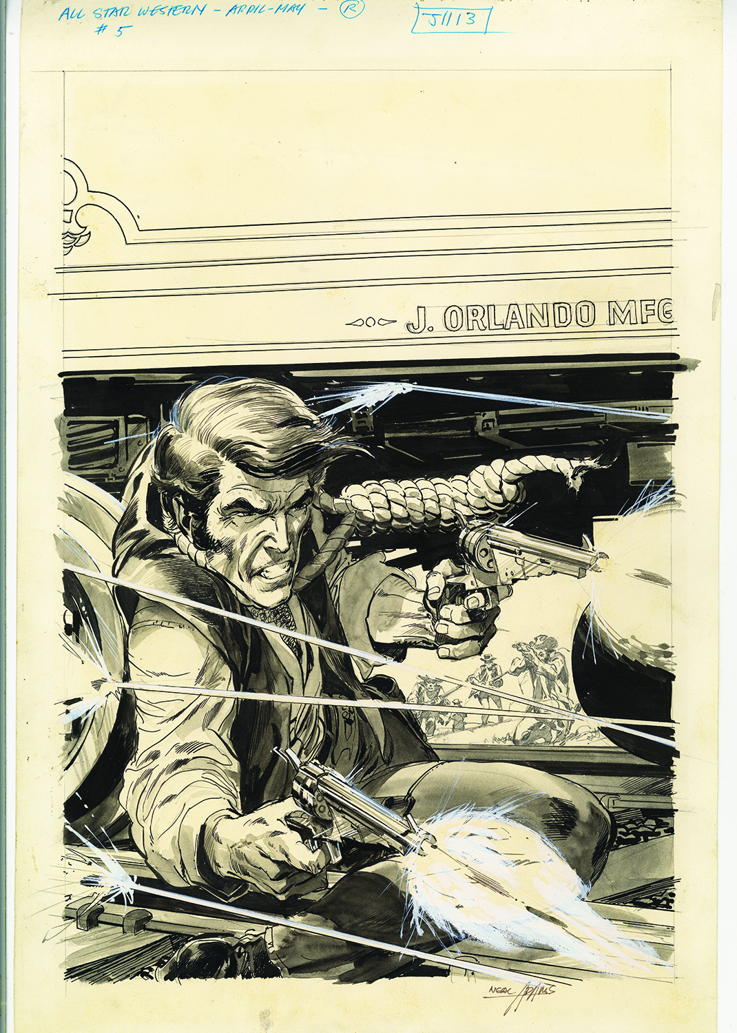 All-Star Western #5. (April-May 1971). An incredible piece of work. I love the wash Neal applied, and the use of white paint to emphasize the gunshots and the ricochets. Outstanding. But take a look at the four figures converging on the outlaw. Neal drew them in pencil to add depth to the cover. Genius.
