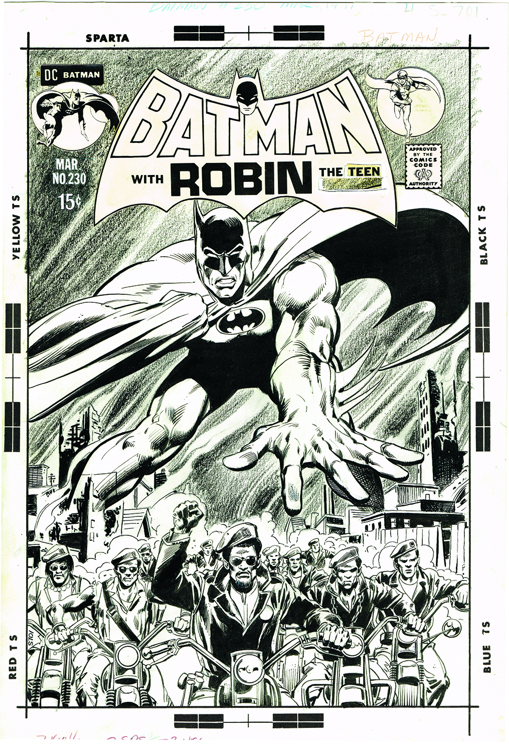 Batman #230 (March 1971). I confess I didn’t love this cover until I saw the original. But if you compare the art to the published piece, you’ll see that the smoke rising from the city is in grease pencil while the comic background is all blacked out. Maybe it was considered too incendiary for the times? Also, the coloring didn’t do it any favors; it’s very dark and difficult to make out the motorcyclists. This is a hidden gem that I never fully appreciated before.