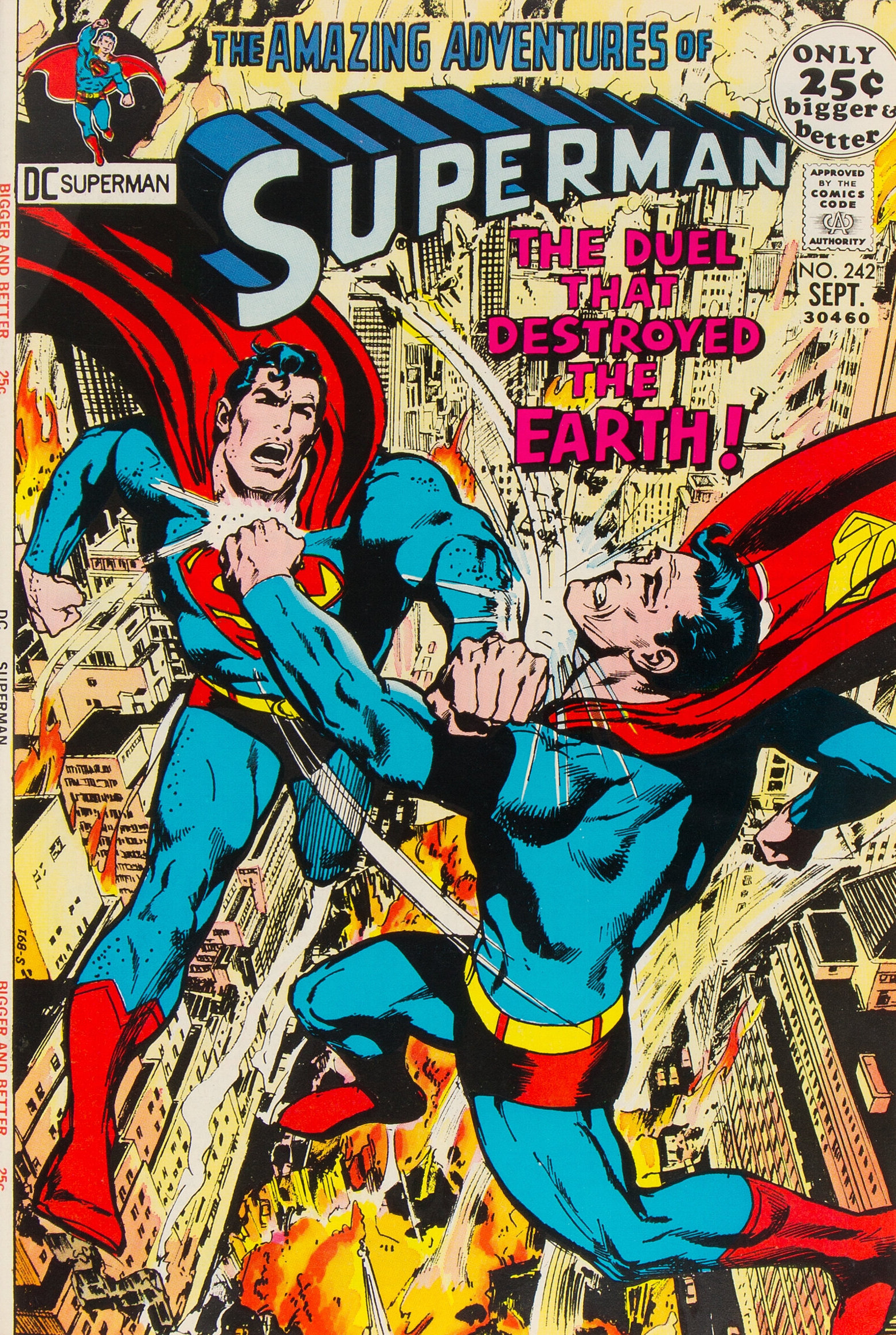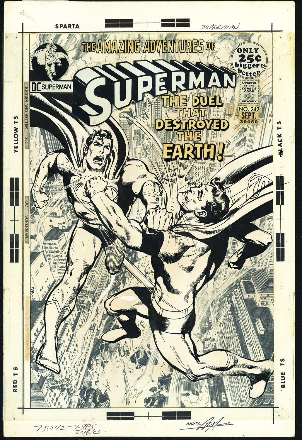 Superman #242 (Sept. 1971). Arguably Neal’s greatest Superman cover. The two figures battling over the smoldering city of Metropolis are stunning… but, look at that background – it is entirely in pencil! Unfortunately the printed cover doesn’t capture the subtlety in the art; instead the colors clash with the work. Another gorgeous image, though.