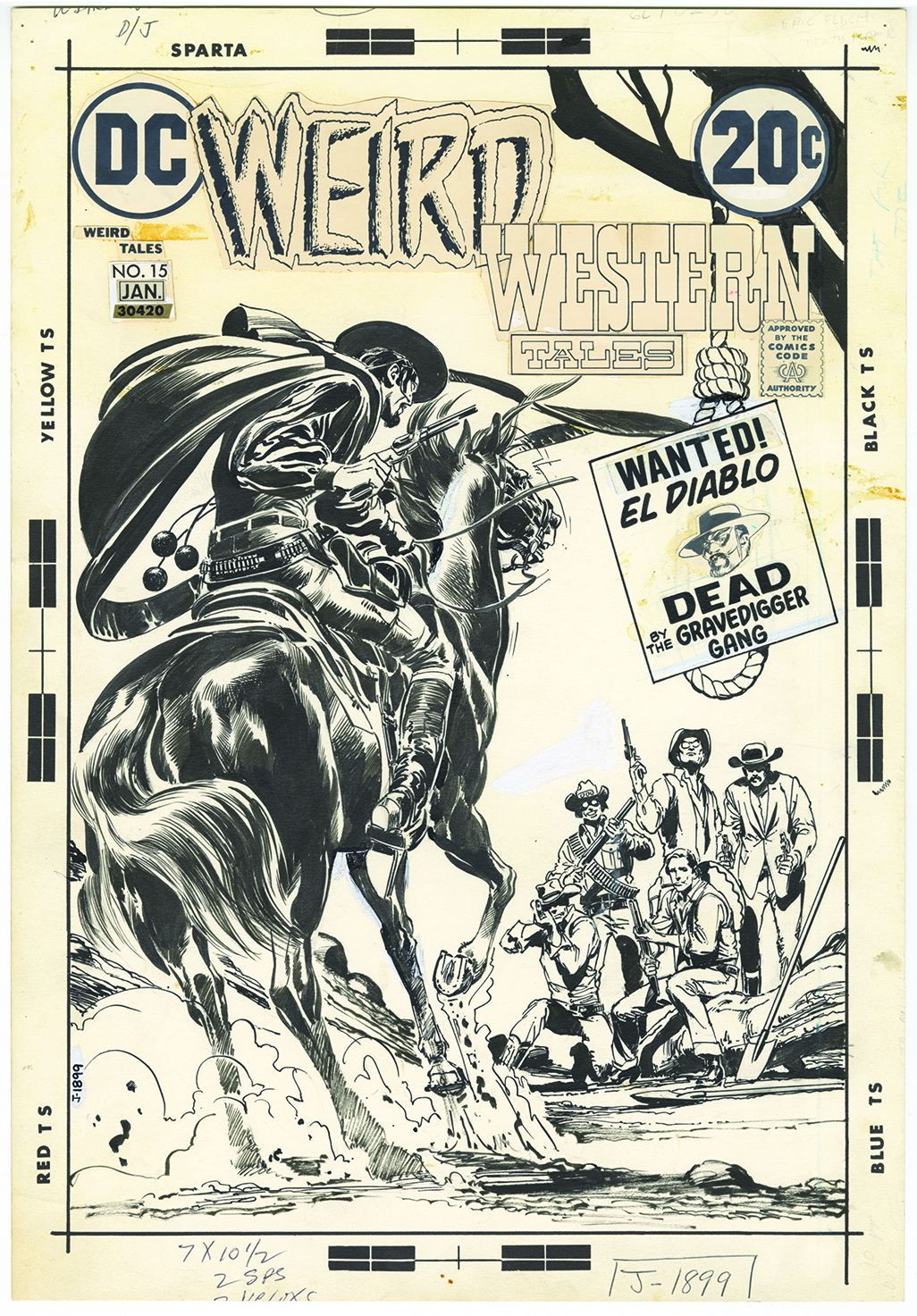 Weird Western Tales #15 (Dec. 1972-Jan. 1973). Just look at that horse! Neal really could draw anything. Speaking of the horse, the inking is terrific, peak Neal. Until you see the original, you never are able to take in just how good it is. Also, for some reason the five figures have been removed from the published cover. There are three images in their place that were reportedly added by editor Joe Orlando. Maybe to make the cover feel more ominous? Regardless, a great cover (and I love the logos!).