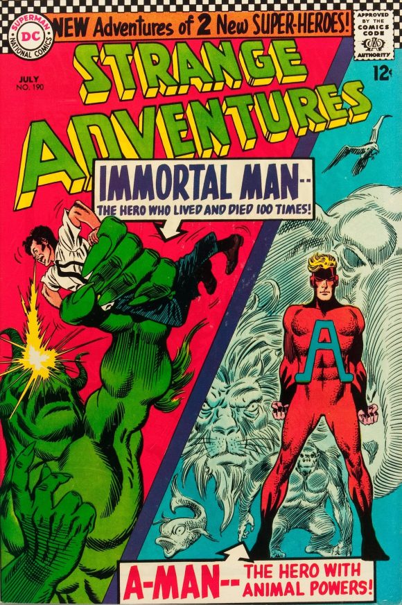 11. Strange Adventures #190 (July 1966). Wonderful combo cover of Immortal Man (who first appeared in #177) and Animal Man (introduced in #180). Pencils by Infantino and inks by Anderson.