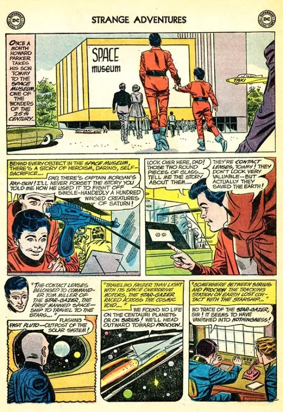 5. Strange Adventures #104 (May 1959). 1st “Space Museum,” a terrific continuing feature, that soon began to appear every three issues. In each story, Howard Parker took his son Tommy to the museum to tell him the history behind artifacts, often involving space invaders.