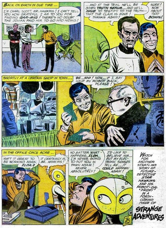 6. Strange Adventures #114 (Mar. 1960). Created by John Broome and Mike Sekowsky, Star Hawkins was a futuristic private detective with a robot secretary named Ilda. The tales were usually of Ilda solving crimes in order to keep working with Star, so he didn’t turn her in to a pawn shop when he was broke and needed cash. Like “Space Museum,” the series would appear every third issue.