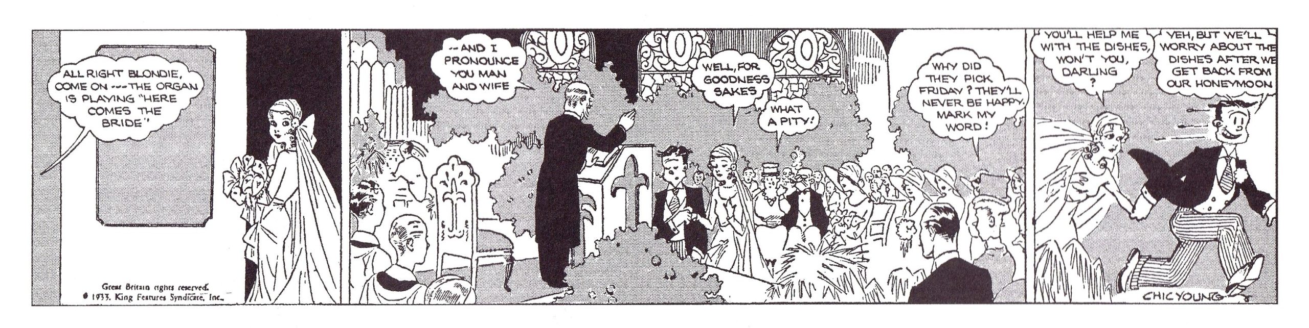 6. Finally, after 28 days of real time, his parents said yes! And on February 17, 1933, Dagwood and Blondie were married in a grand ceremony — but the marriage came with a consequence that Dagwood agreed to heartily: He was disinherited from the family fortune. And, thus, was created the happy middle-class family situation that has survived to this day.