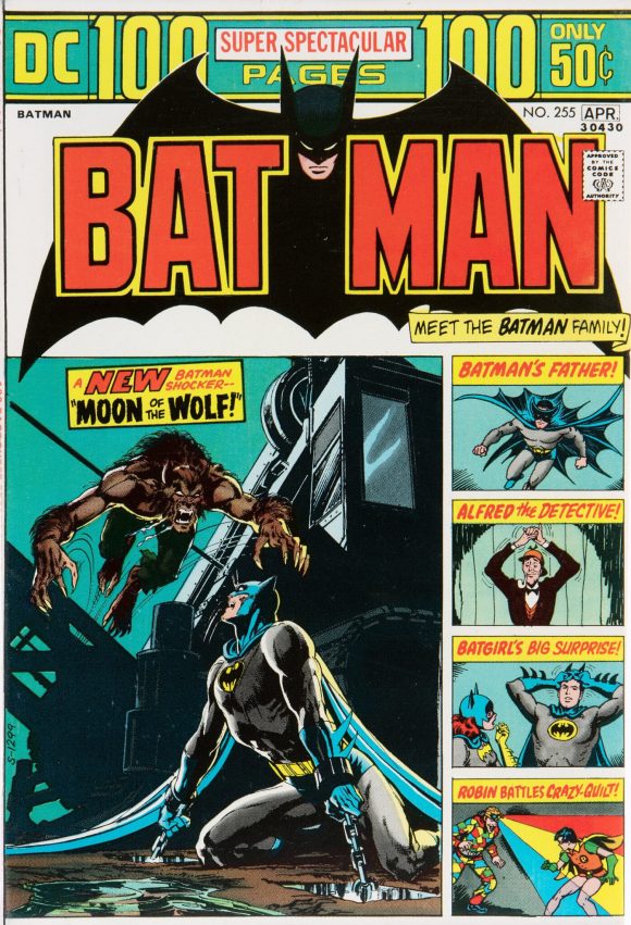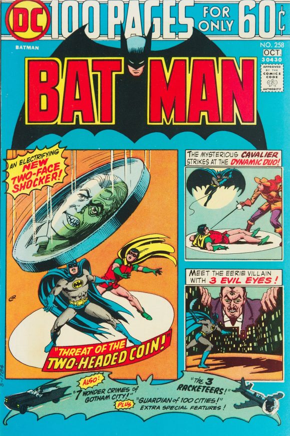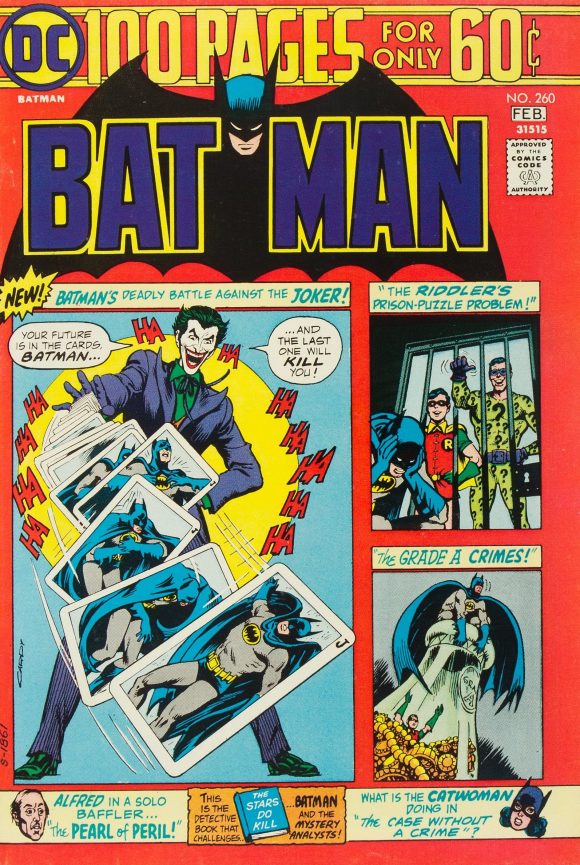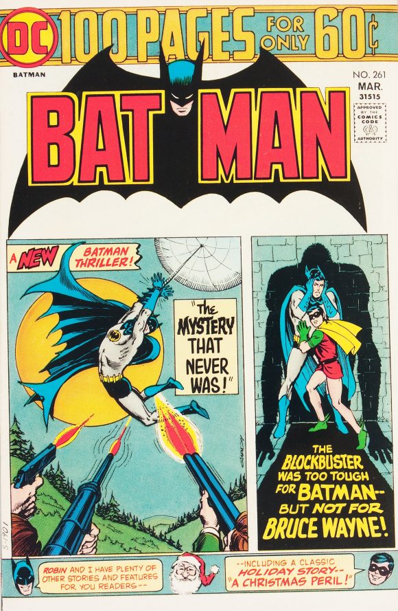 Superman Presents Tip Top Comic Monthly #123 (circa July 1975). Let me make this clear: I love DC’s 100-pagers and I love their Batman covers. But there’s no question that, like the issue above, they didn’t do the main images any favors. So compare this to Nick Cardy’s Batman #257, (July-Aug. 1974). I miss the red, though.