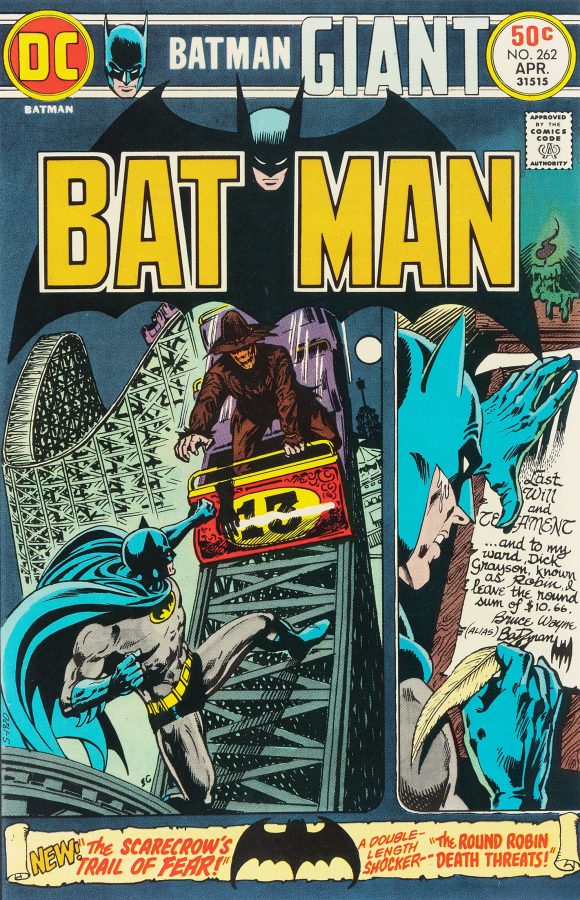 Batman #128 (circa Dec. 1975). A substantial improvement over Ernie Chan’s Batman #262 (April 1975), which always felt too mashed together. The Australian edition makes for a more memorable cover. The bat silhouette with “The Scarecrow’s Trail of Fear!” in bold red letters is a nice addition.