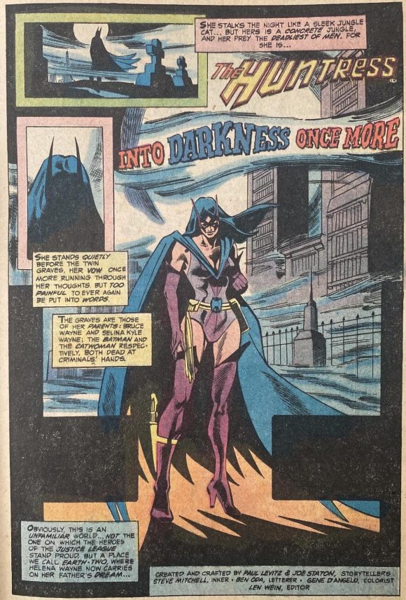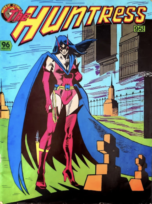 The Huntress (circa July 1982). Another mag-size one-off, giving the Huntress the headline treatment she hadn’t yet enjoyed in the States. Collects her first 15 back-up stories from Wonder Woman, which started in Issue #271 (Sept. 1980). The cover, by Joe Staton and Steve Mitchell, is from #271’s splash.