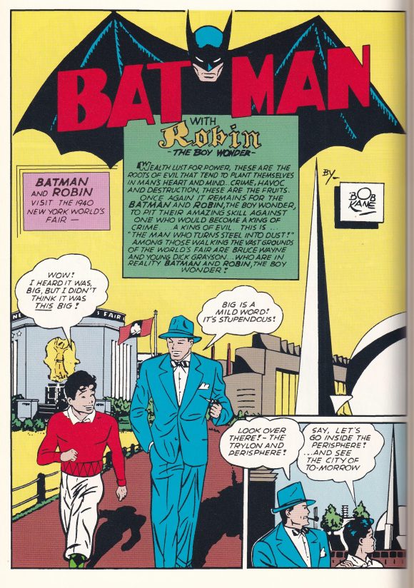 Batman, written by Finger and drawn by Kane, with backgrounds by Roussos