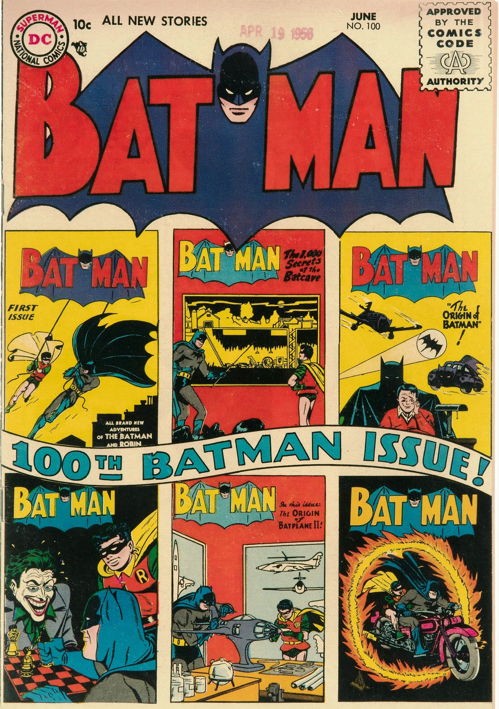Batman #100 cover (June 1956, DC) with inserts of classic images. (Top row, left to right – Batman #1, #23, and #25. Bottom row, left to right – Batman #47, #48, and #61.)