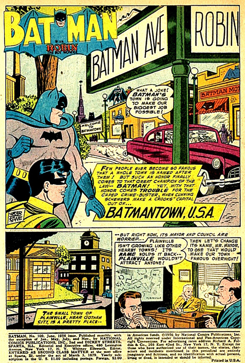 An offbeat anniversary in the history of Batman is upon us: Exactly 70 years ago (on April 17, 1956) the Batman series celebrated its 100th issue. Well, it celebrated at least by showing off on its front six great covers from the series’ then-16 year run.