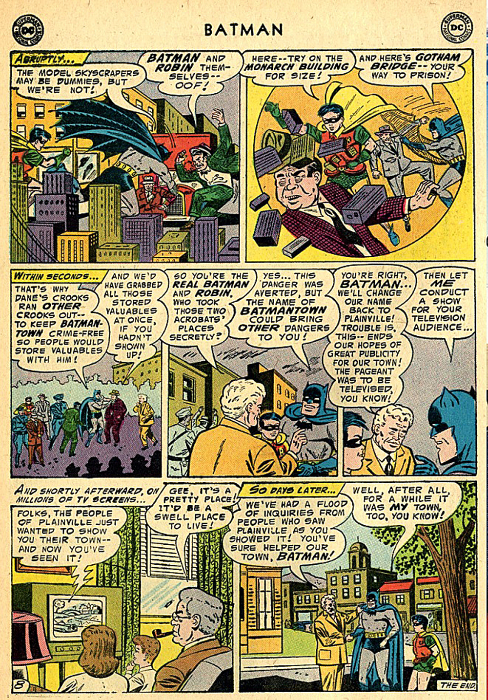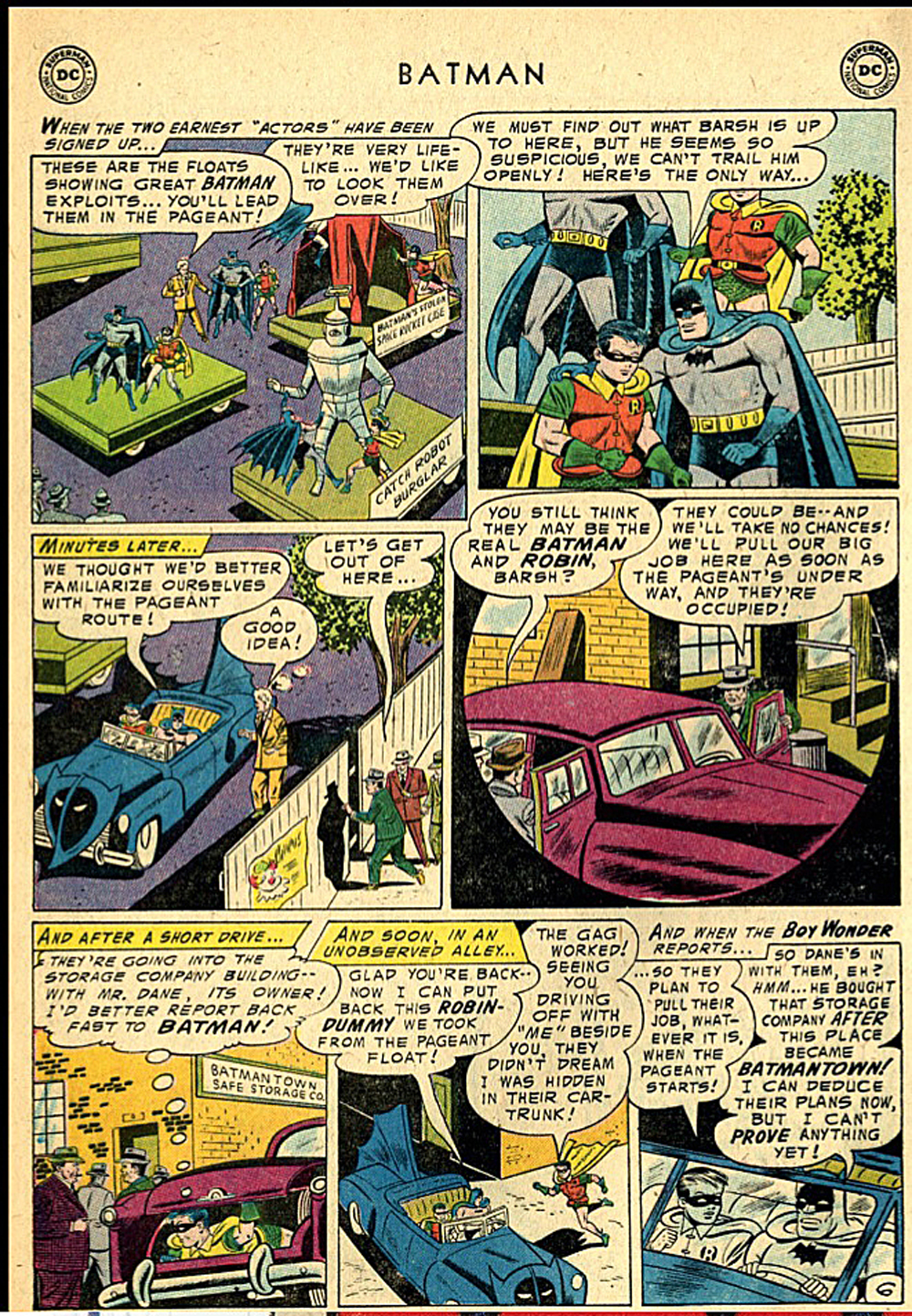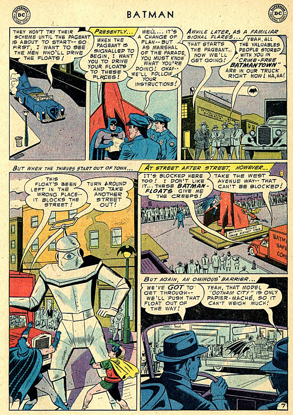 All the inventions are turned over to the Caped Crusader to determine the winner — and “the Bat-Cave is piled high with scores of unusual entries.” (You really have to wonder how Batman was able to cart them there without being seen. Did the citizens of Gotham just turn their backs politely so they wouldn’t notice the line of trucks heading toward the secret Bat-Cave? Did Batman assign Wayne Manor as the send-to address on the contest forms because they were such good friends?)