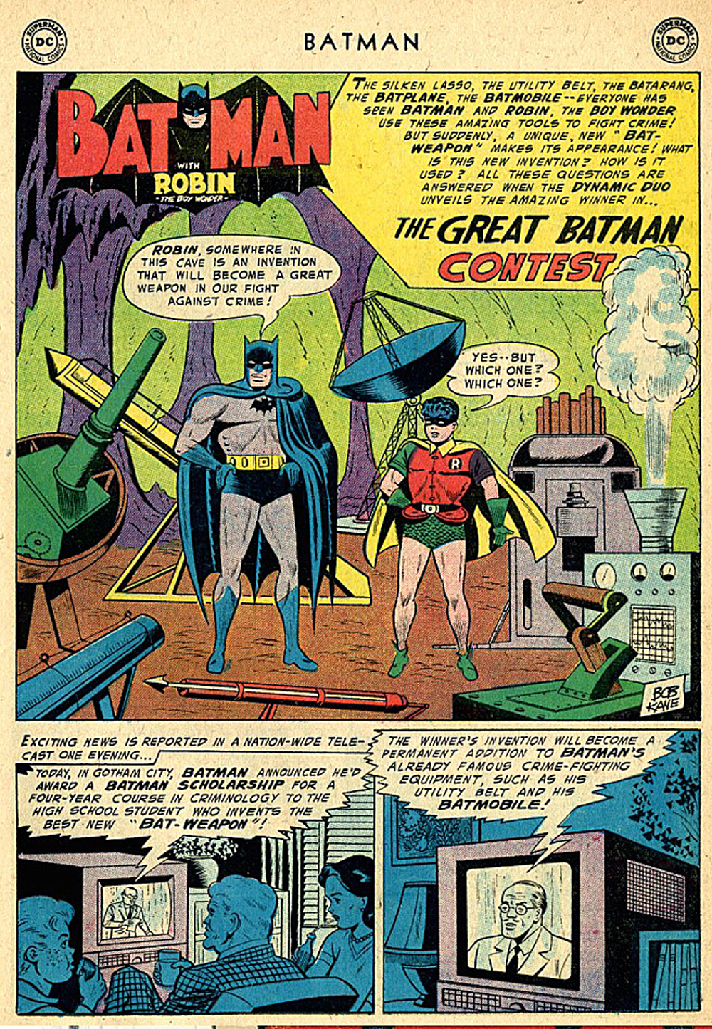 The final Batman tale in the issue, “The Great Batman Contest” (written by Bill Finger), involves a competition that invites inventive youths to come up with a new weapon to aid Batman in his crime-fighting activities.