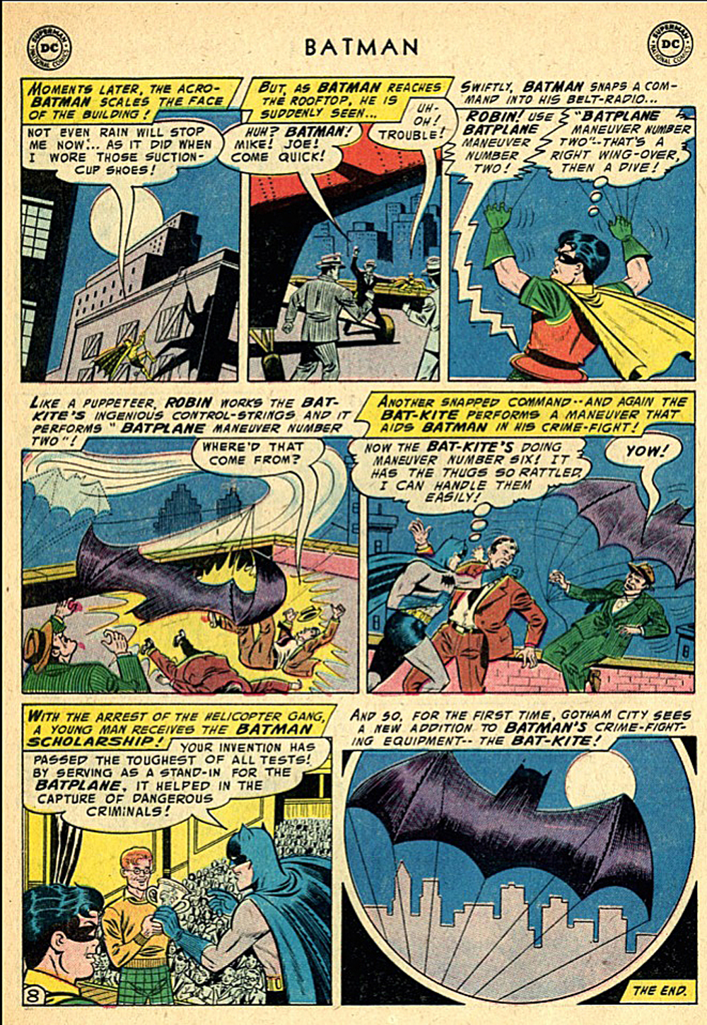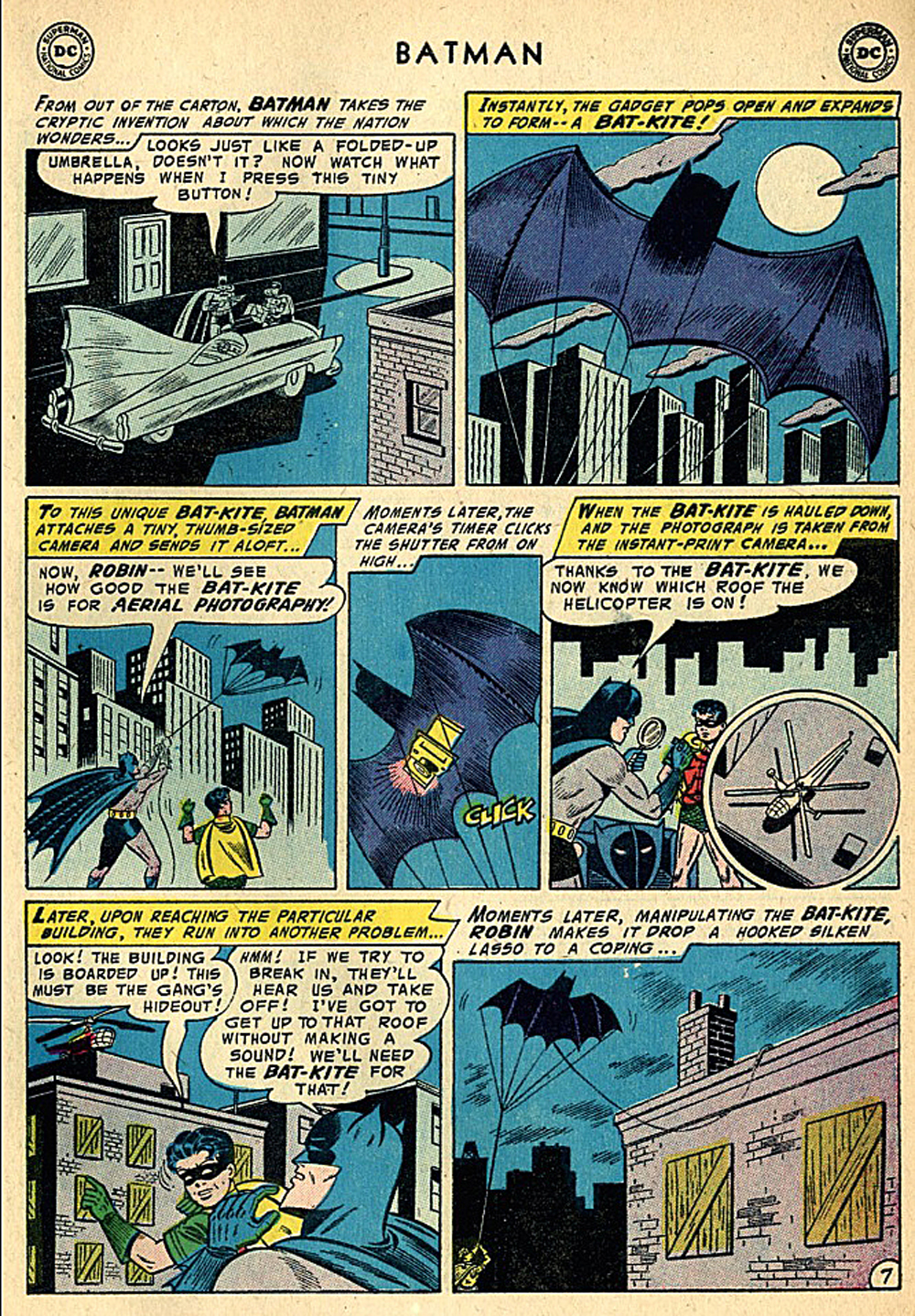 The inventions are a varied lot, from a flashlight projector equipped with an encyclopedia on criminology, to a Batmobile cannon catapult, to a plastic inflatable Batboat, to suction-cup shoes for walking up the sides of buildings. (Oh, no, you don’t! No taking away from one of the best gags of the 1966 Batman TV series!) The winning entry, though, is a Bat-kite, of all things, with a camera attached underneath it for aerial photography.