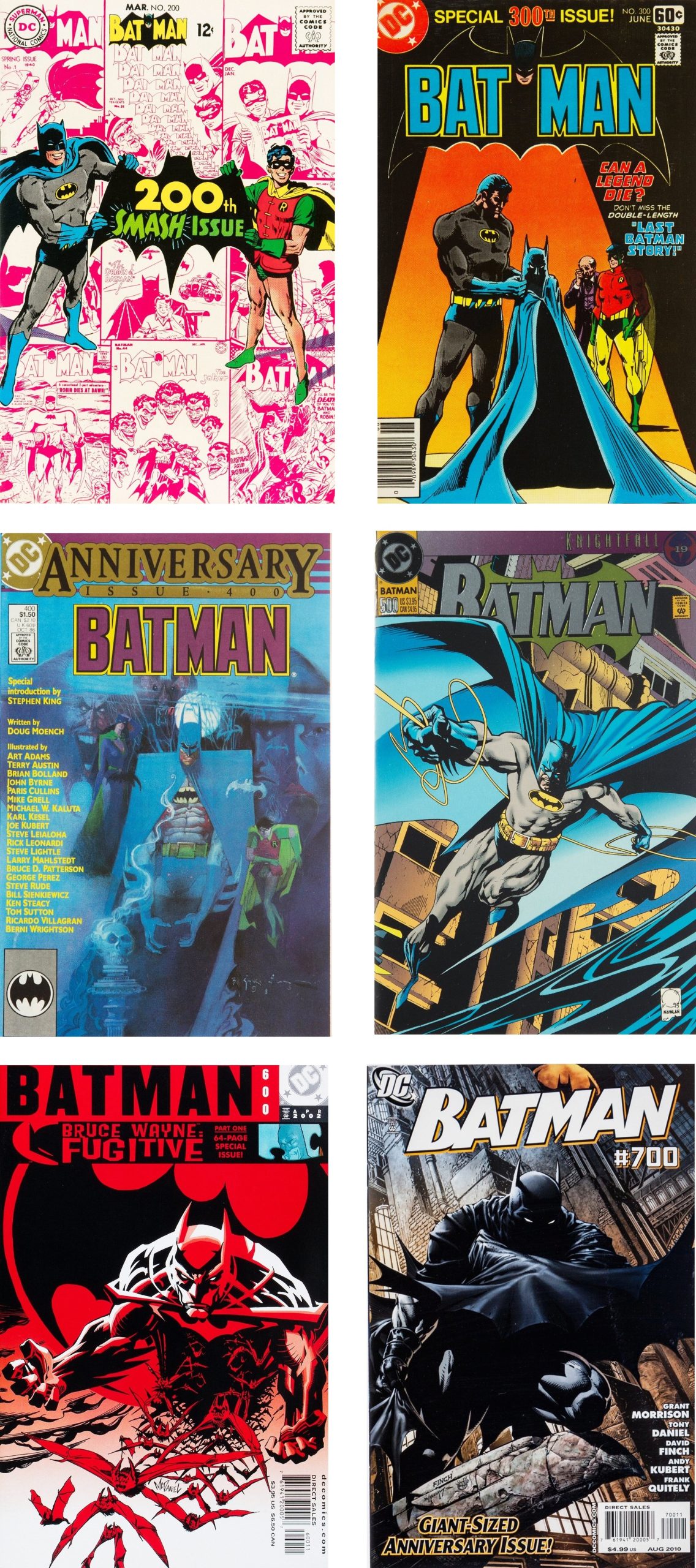 Covers for Batman #200 (Mar. 1968. Neal Adams art); #300 (June 1978. Dick Giordano art); #400 (Oct. 1986. Bill Sienkiewicz art); #500 (Oct. 1993. Joe Quesada pencils and Kevin Nowlan inks); #600 (Apr. 2002, Scott McDaniel art); and #700 (Aug. 2010. David Finch pencils and Scott Williams inks).