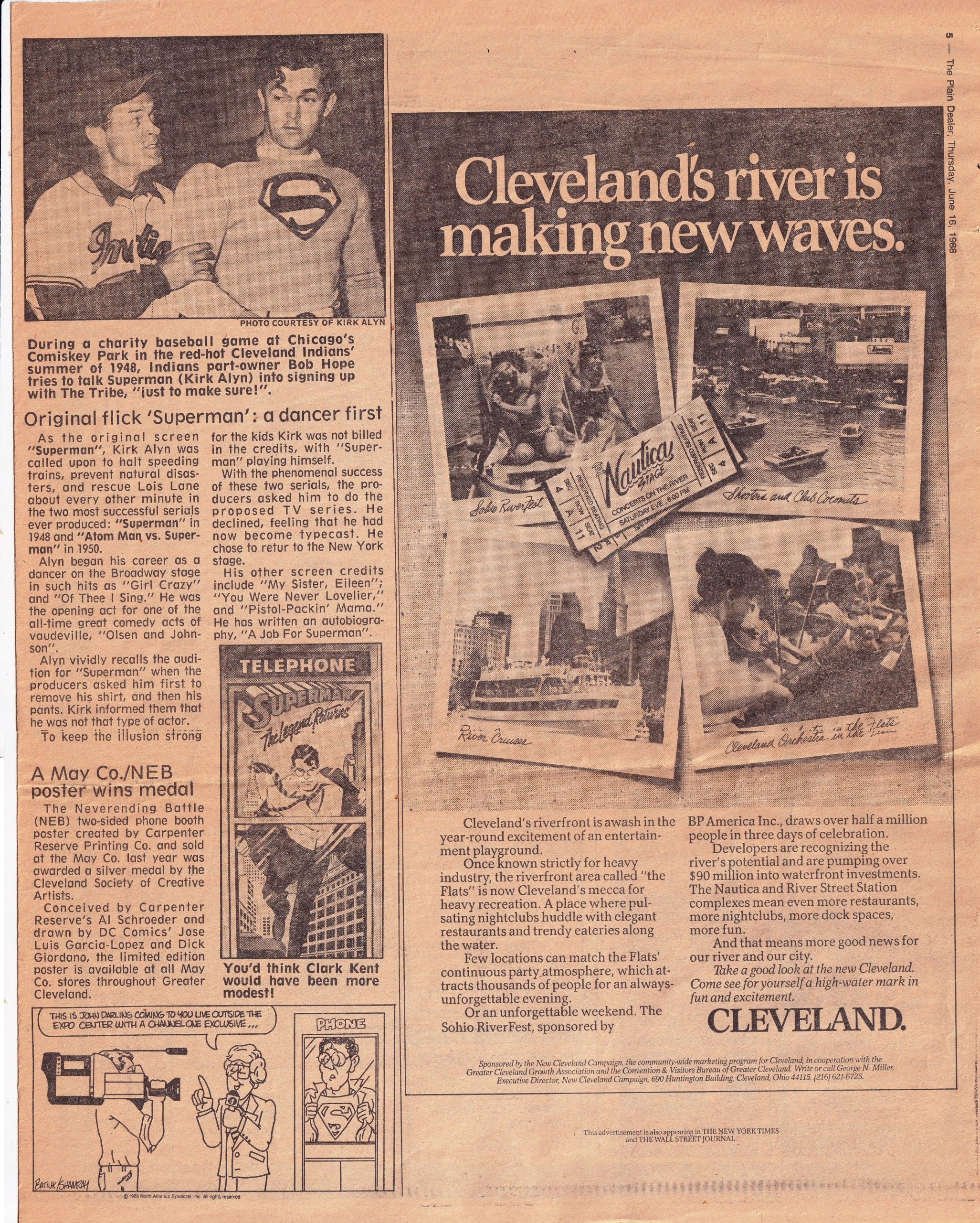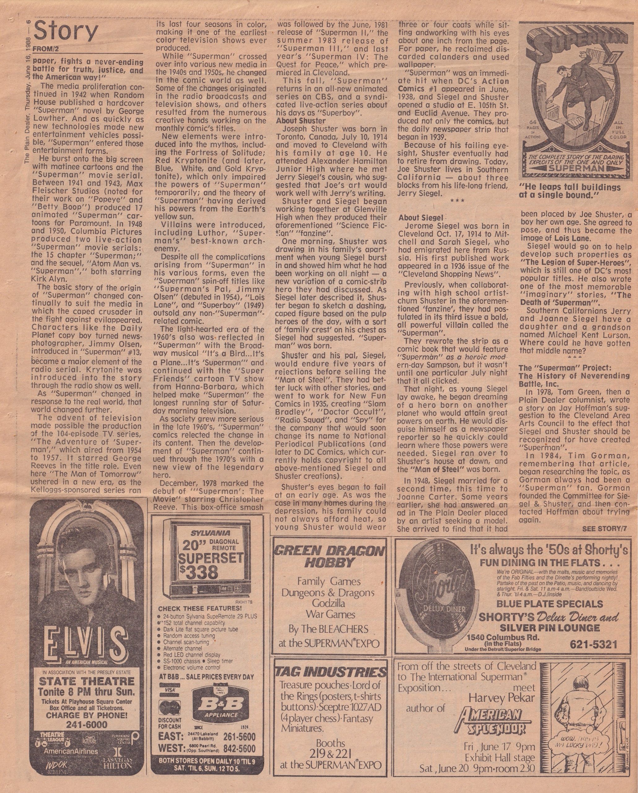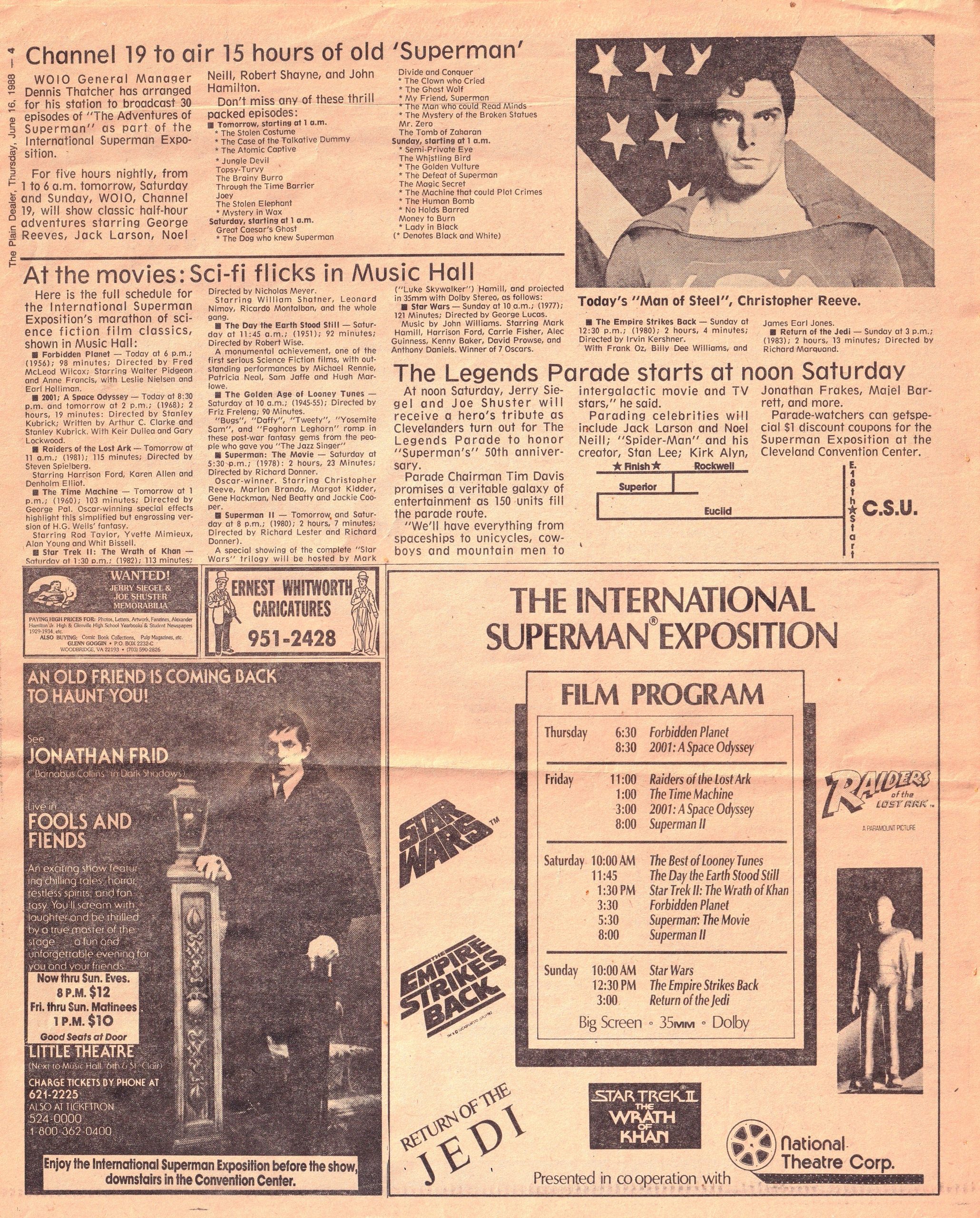 And then I was off to Cleveland. In addition to the exposition, the city was holding several events to mark the occasion (which can be found below, within the pages of an 8-page supplement to the June 16 Cleveland Plain Dealer newspaper). The Superman convention (which I think of it as) featured guests Kirk Alyn, Noel Neill, Jack Larson, Curt Swan, George Pérez, Julie Schwartz, Jerry Ordway, Harlan Ellison, Roger Stern, Mike Carlin, and Marv Wolfman. Mark Hamill and Jonathan Frakes were both scheduled to attend but cancelled. Siegel and Shuster did not attend.