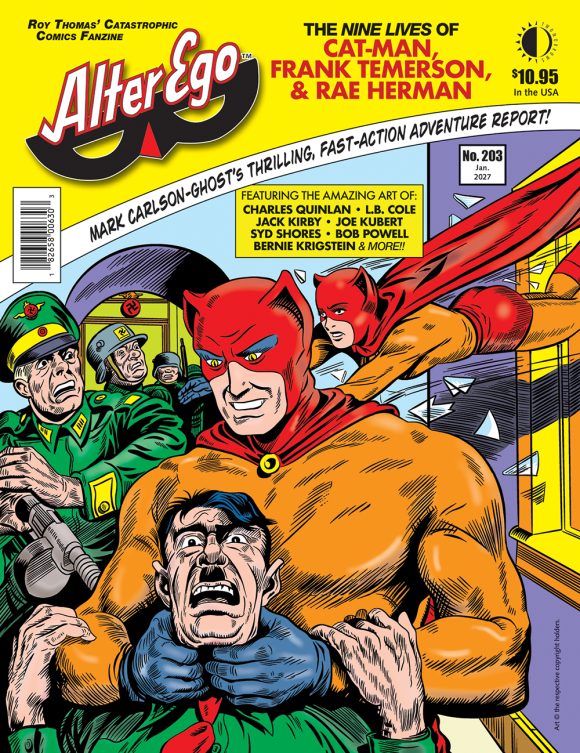 In Alter Ego #203, “The Cat-Man Cometh!”, wherein we examine the star-crossed and multi-company Golden Age careers of Frank Temerson and Rae Herman, featuring Cat-Man and Kitten, Green Hornet, Captains Aero and Fearless, Miss Victory—and the awesome art of Charles Quinlan, Jack Kirby, L.B. Cole, Joe Kubert, Syd Shores, Bob Powell, Bernie Krigstein, et al. Plus FCA (Fawcett Collectors of America), and Mr. Monster in his Comic Crypt (with Michael T. Gilbert)! Cover by Charles Quinlan! Edited by Roy Thomas.