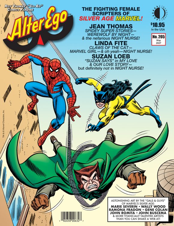 Alter Ego #205 turns its attention to the talented and fabulous females of the Silver Age Marvel Bullpen! Sharing recollections are Jean Thomas (Spidey Super Stories, Night Nurse, Werewolf by Night), Linda Fite (Claws of the Cat, Marvel Girl), Susan Loeb (the typewriter behind many a lovelorn letter-answer), plus behind-the-scenes secrets from the Marvel of the late ‘60s early ‘70s! Also, there’s FCA (Fawcett Collectors of America), and Michael T. Gilbert rummaging through Mr. Monster’s Comic Crypt! Cover by John Romita Sr.! Edited by Roy Thomas.