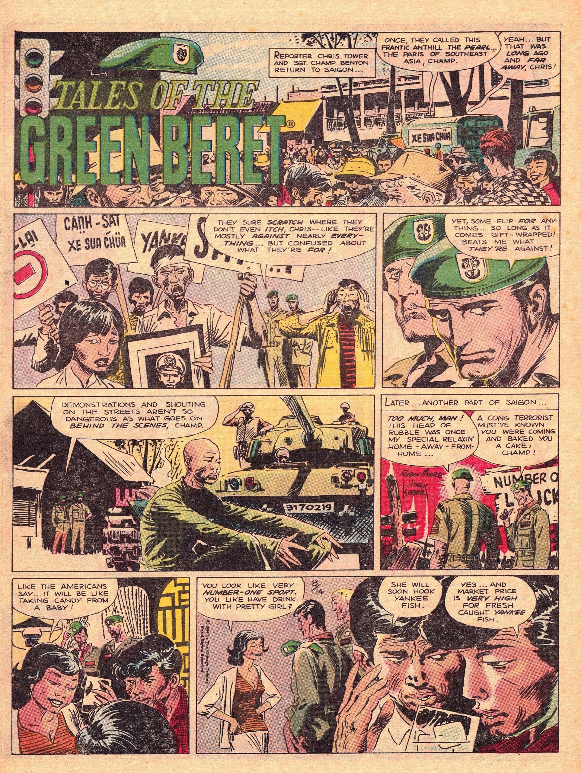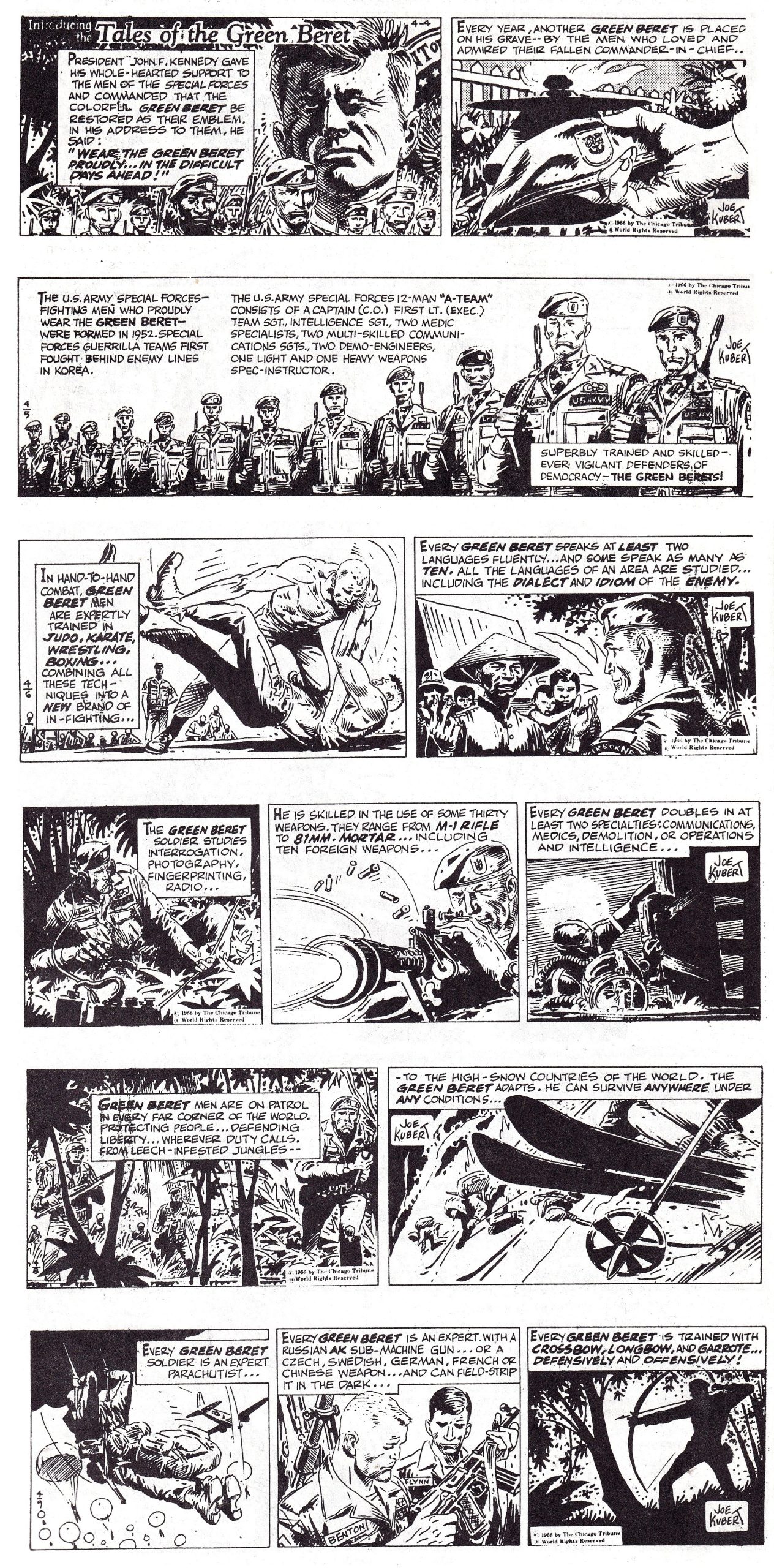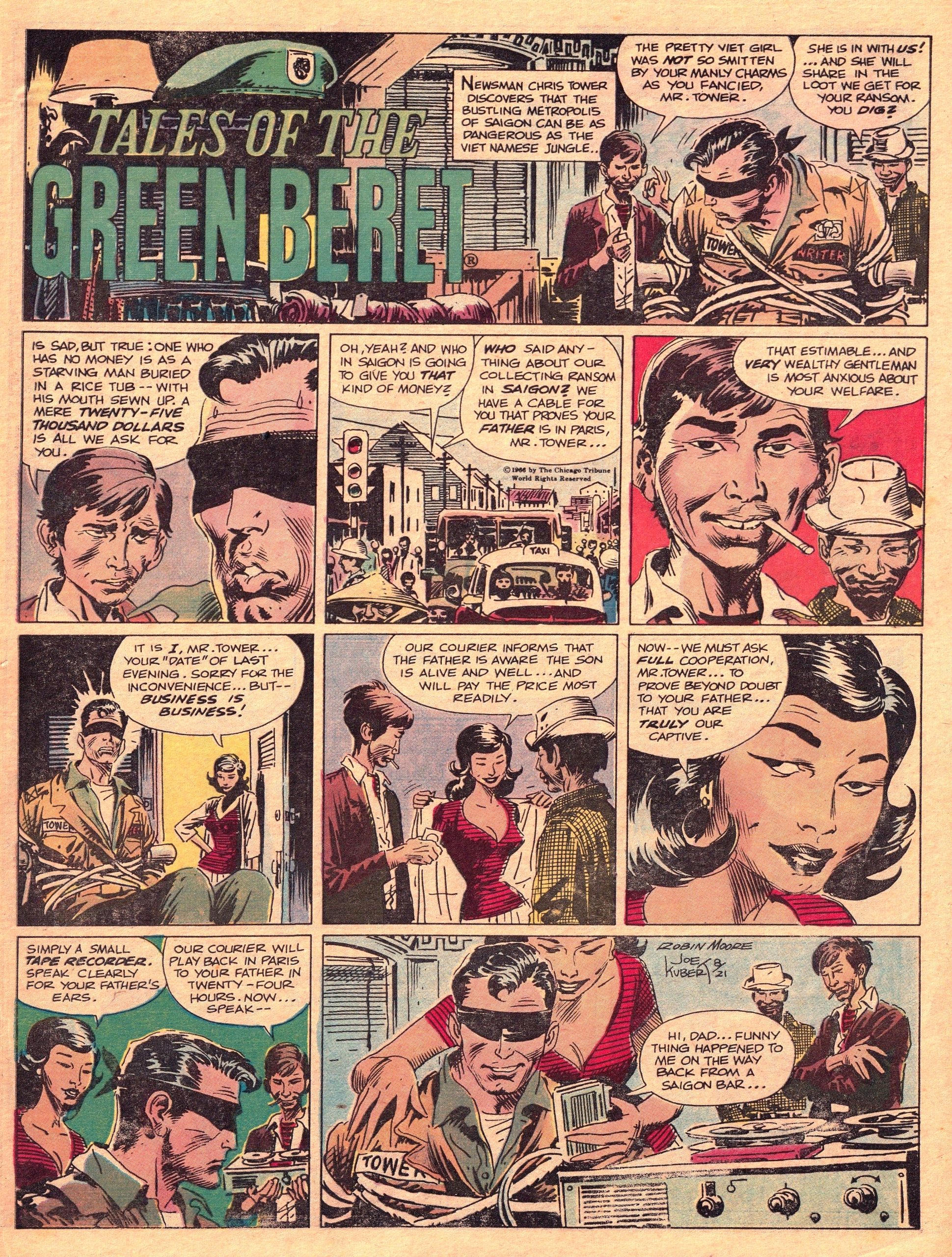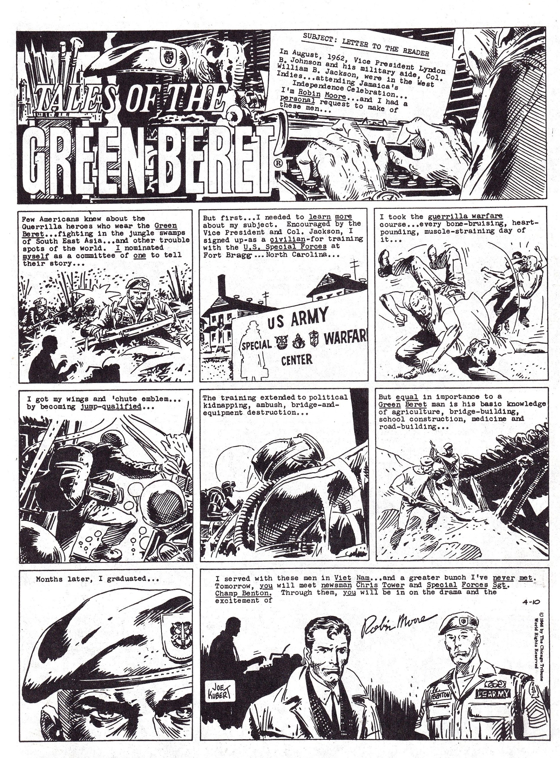 Tales of the Green Beret debuted with an initial limited run of 72 daily strips after a short introduction. It returned April 4, 1966, for full-on syndication across the country and ran until July 21, 1968. The strip was credited as being written by Robin Moore, who authored the best-selling novel, The Green Berets, and co-wrote the lyrics of the unlikely hit song The Ballad of the Green Berets with Barry Sadler.