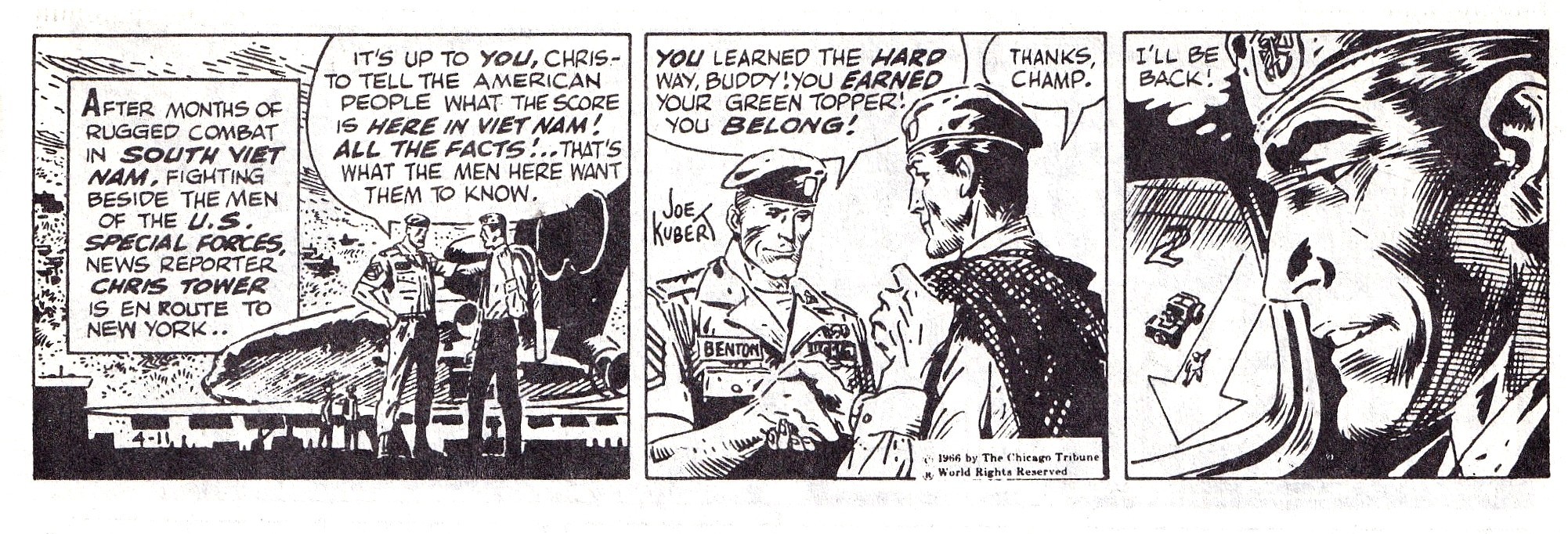 Kubert joined with the understanding that it would be an adventure strip and not a political one, and that’s how it began. As time went on, however, the writing reflected a favorable attitude about the conflict, as the nation’s sentiment grew more negative. (The strip did also tell stories from other parts of the world, it’s worth noting.) Kubert became unhappy and left.