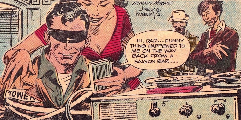 There have been, however, conflicting stories about who wrote the strip. In the introduction to a 1986 Blackthorne Publishing volume reprinting the first several months of the 1966 run, Moore noted: “Jerry (Capp), along with veteran comic strip writer Howard Liss and artist Joe Kubert and myself put together a year’s worth of continuity, stories both from my book and others I created from my experiences in Vietnam.” Kubert, in an interview with writer Matt Tauber that appeared in 2008, said the strip was written by Capp and, as to Moore, “he did not actually write it.” Replying to that statement, Moore’s widow, Helen, wrote, “Robin was involved in the writing and approved all the story lines.”
