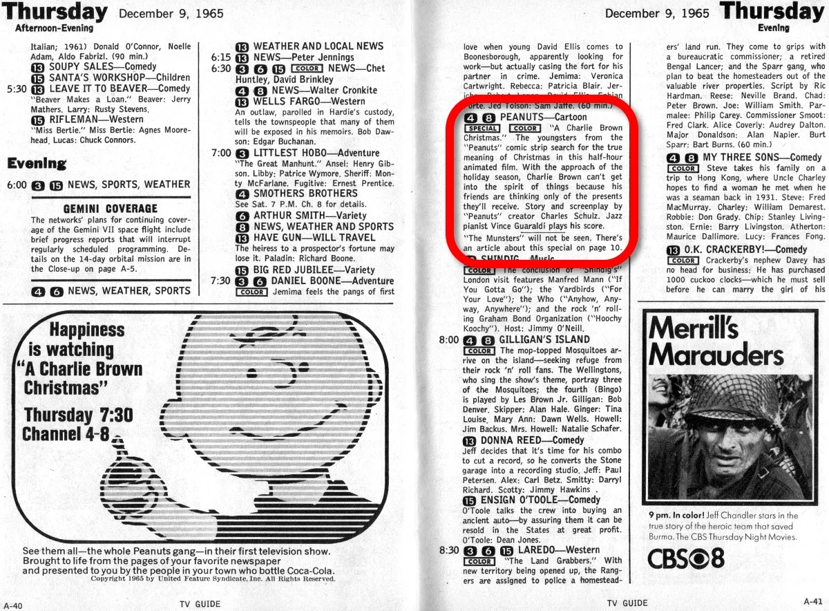 12. CBS executives hated the finished special and considered not airing it. They thought it was too slow, the jazz music didn’t work, the animation was too simple, the voices sounded amateurish… even Mendelson and Melendez felt that they had ruined Peanuts. Fortunately for the world, the TV Guide ads and listings had already gone to print, so CBS felt they had no choice but to put it on the air. They figured it would play once, and then that would be it. Everyone would forget about it.