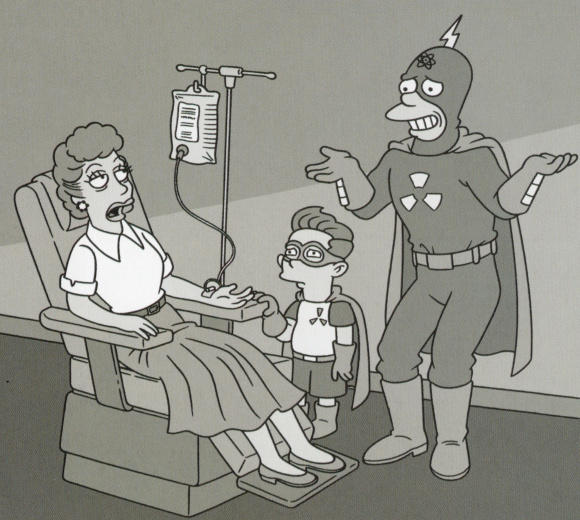 But before I examine Paul’s foreword, a little background on the Nuclear Knight. Radioactive Man first appeared on The Simpsons Season 1 episode, “Bart the Genius,” on the cover of a Radioactive Man comic book, but he bore very little resemblance to the Irradiated Crusader of today. His second appearance, this time with his sidekick Fallout Boy, came in the Season 2 episode, “Three Men and a Comic Book” in which Bart and his friends, Milhouse and Martin, pool their money to buy a copy of Radioactive Man #1 and proceed to fight over who gets to take custody of the vintage comic book.