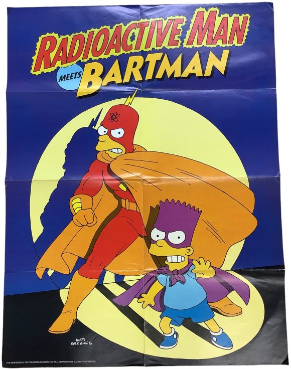 When Matt Groening, Steve Vance, Cindy Vance, and I were crafting the first Simpsons comic book, Simpsons Comics and Stories, Steve decided to feature Radioactive Man in the very first Bartman story. In this tale, Bart meets Radioactive Man’s creator Morty Mann, and, as Bartman, challenges evil publisher Arnold Leach to come clean for decades of unjust treatment toward Mann. This comic also features Radioactive Man in a vignette on the cover, and came polybagged with a Batman and Robin-inspired poster of Bartman and Radioactive Man by yours truly!