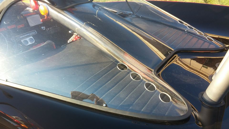 5. The dragster has four holes cut in each rear windshield bubble, as an air outlet. The rear windshields ripped off the car on the drag strip.