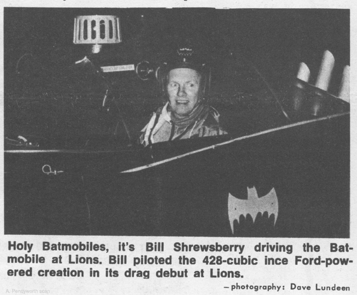 13. The #4 dragster was the only other 1966 Batmobile besides the #1 used on the show. The #4 was used in the background in the Batcave in one scene in “The Contaminated Cowl.” You can best tell it’s the #4 by the large amber truck light on the arch, but sharp eyes will also note that there is no chrome windshield molding, and that the door bat is missing the white outline.