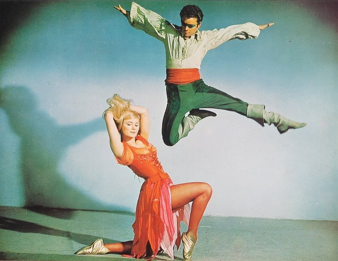 MGM photo of a Robin-like, masked Russ Tamblyn (with Yvette Mimieux) from The Wonderful World of the Brothers Grimm (1962).