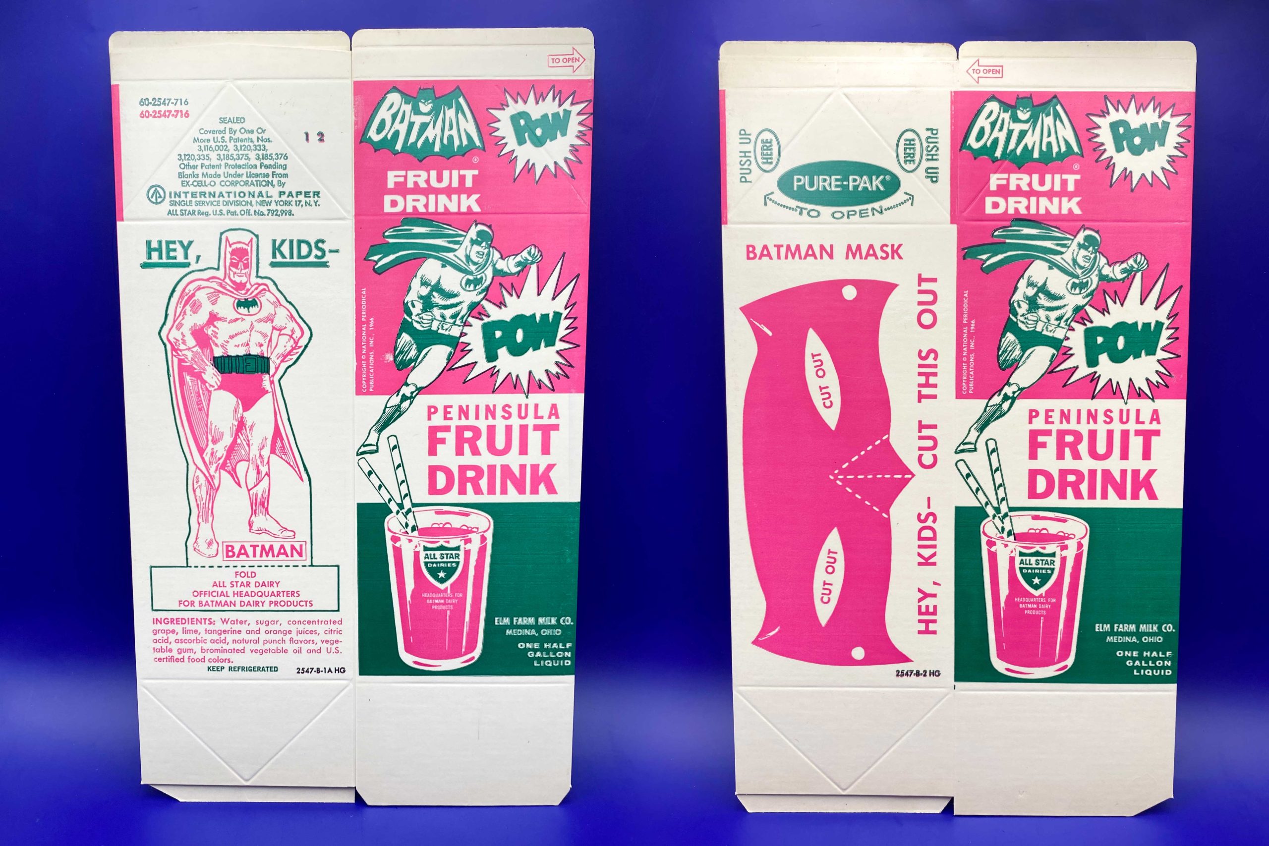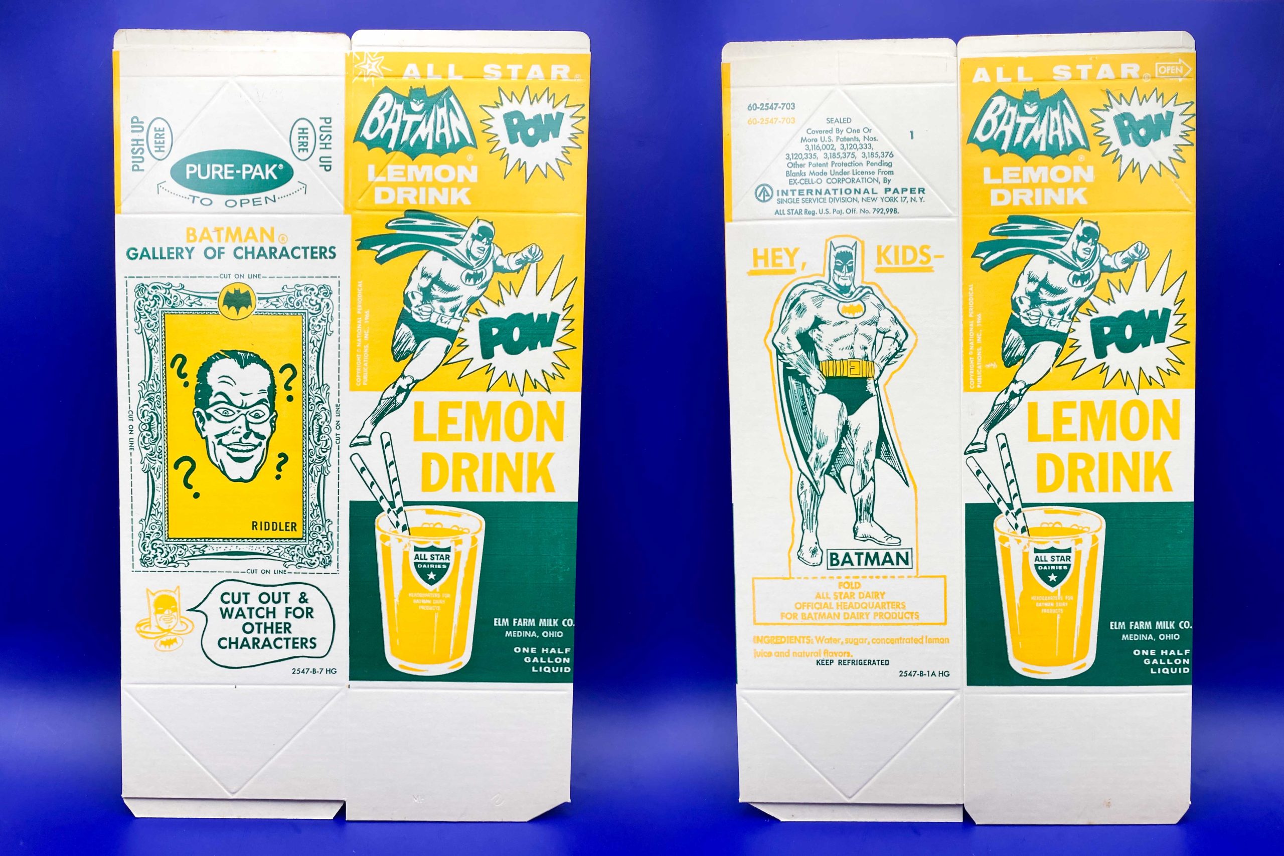 From out of the refrigerator, you pull cartons of two fruity drinks. But are you in more of a lemon mood, or a “Peninsula Fruit” mood (whatever that means)? Taste aside, both have a nice cut-out standee of Batman on the side. But the lemon one has a card featuring one of your favorite Bat-foes, the Riddler. The other has a Bat-mask that looks entirely too small for your head. So, you go with the lemon and Riddler.