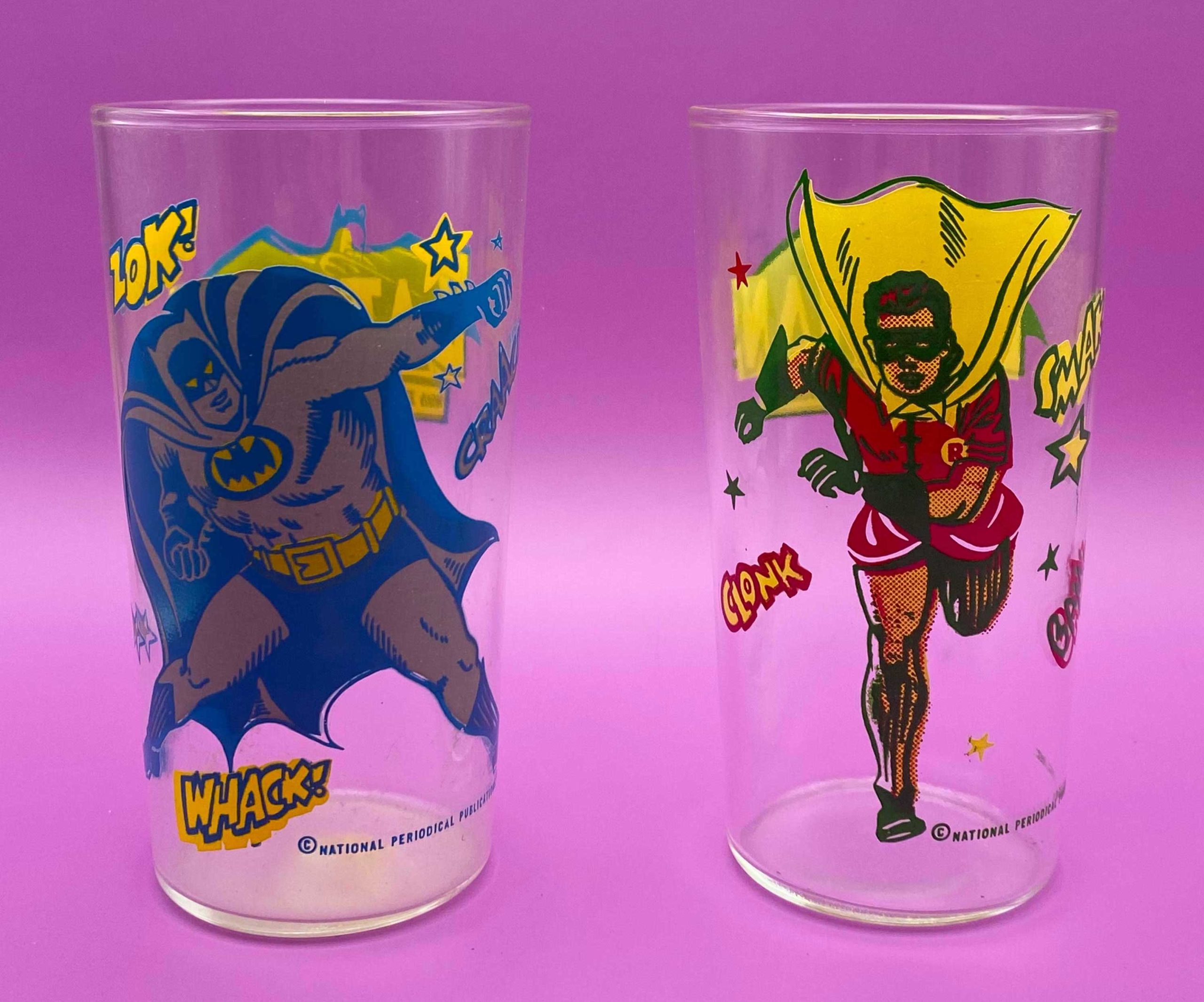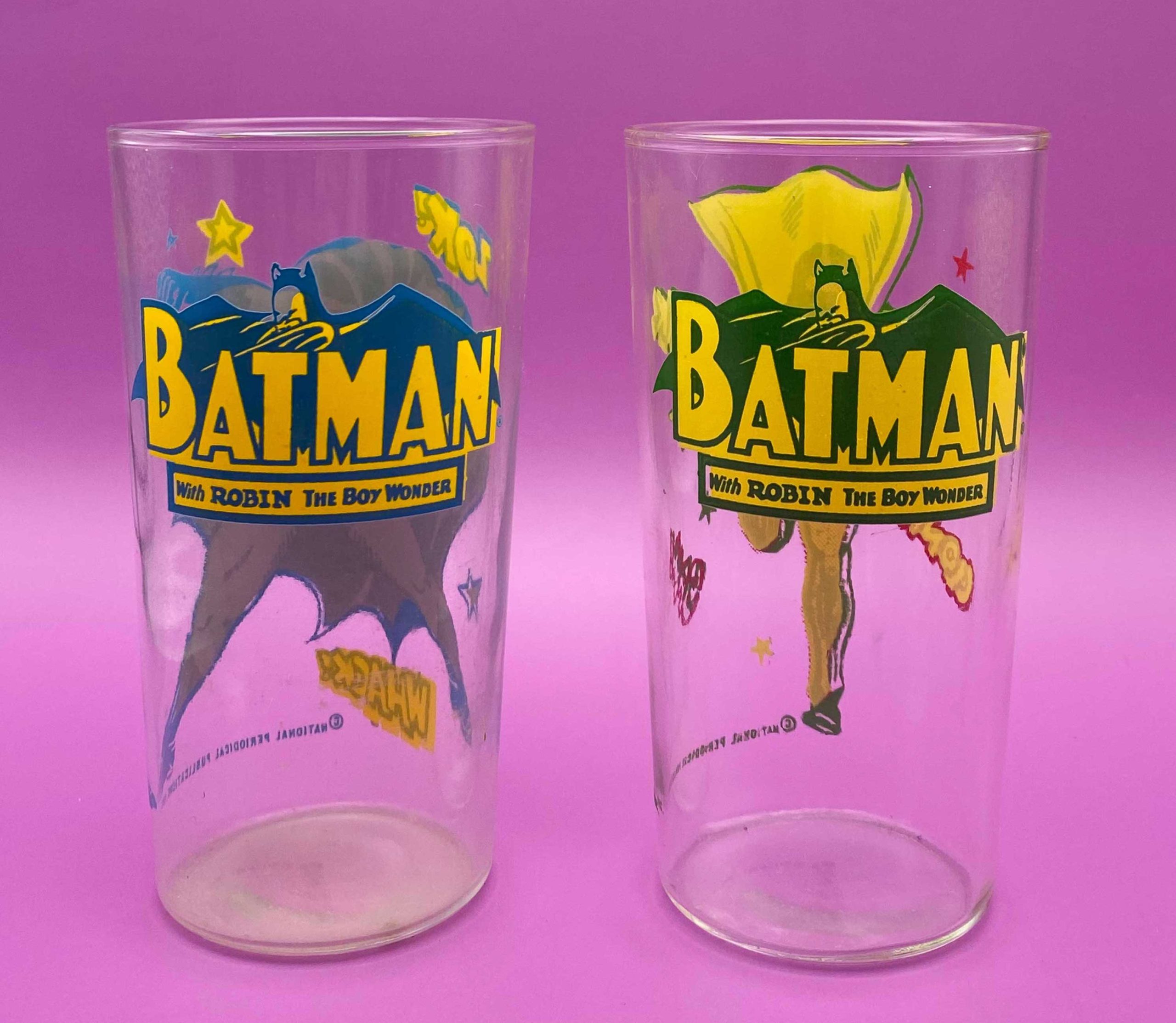 Now for another tough decision: Batman or Robin? Which glass do you pick to contain your beverage choice? The Robin glass is far more colorful, but since you chose lemon, the blue and gray of Batman will pop better. You opt for the Caped Crusader.