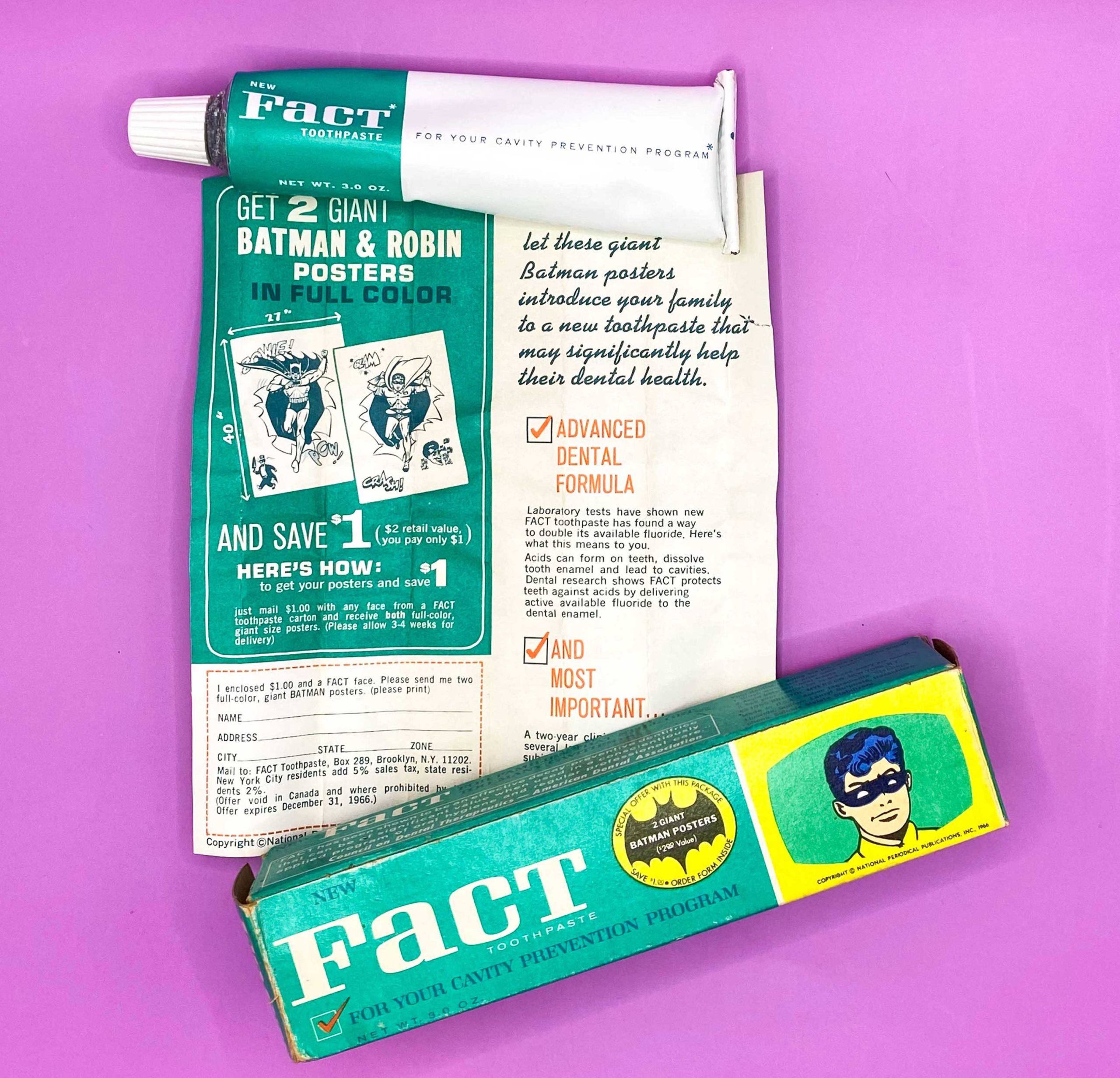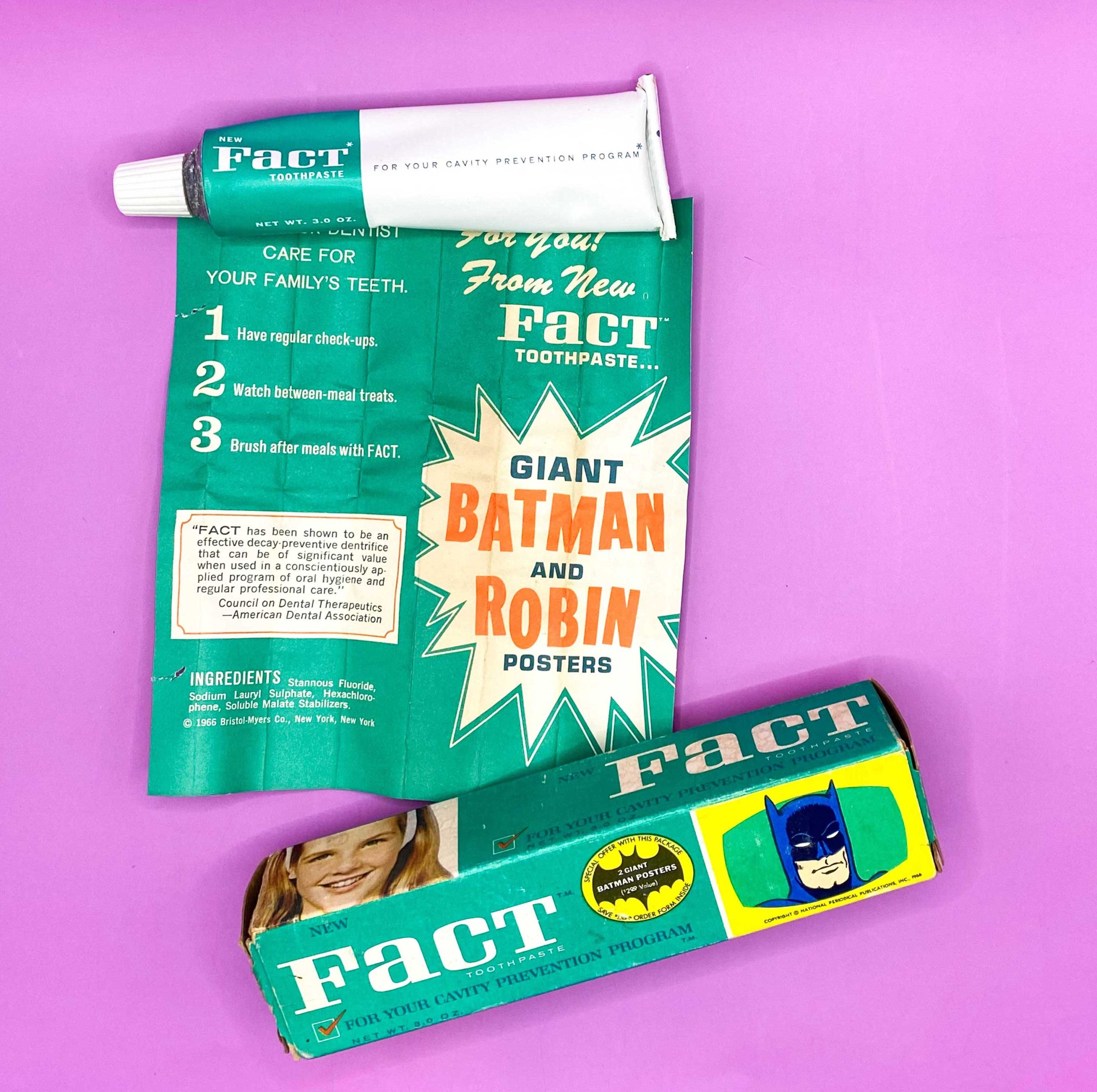 You awaken on a typical Wednesday school day and brush your teeth with the new Fact toothpaste you talked your mom into buying. She was moved by the promise of cavity prevention. You wanted the sweet Batman and Robin mail-in posters you saw advertised on the most recent Batman episode, pitched to you by none other than Alfred himself!