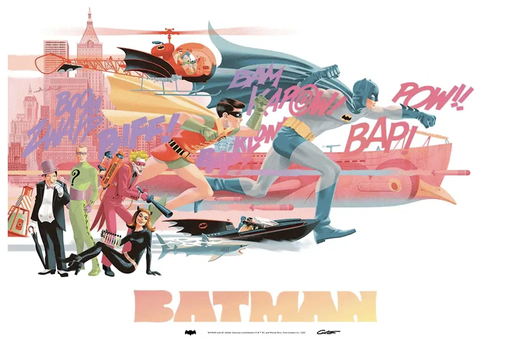 Now, he’s back with a magnificent print that pays homage to the 1966 Batman movie starring Adam West and Burt Ward that will celebrate its 60th anniversary this summer.
