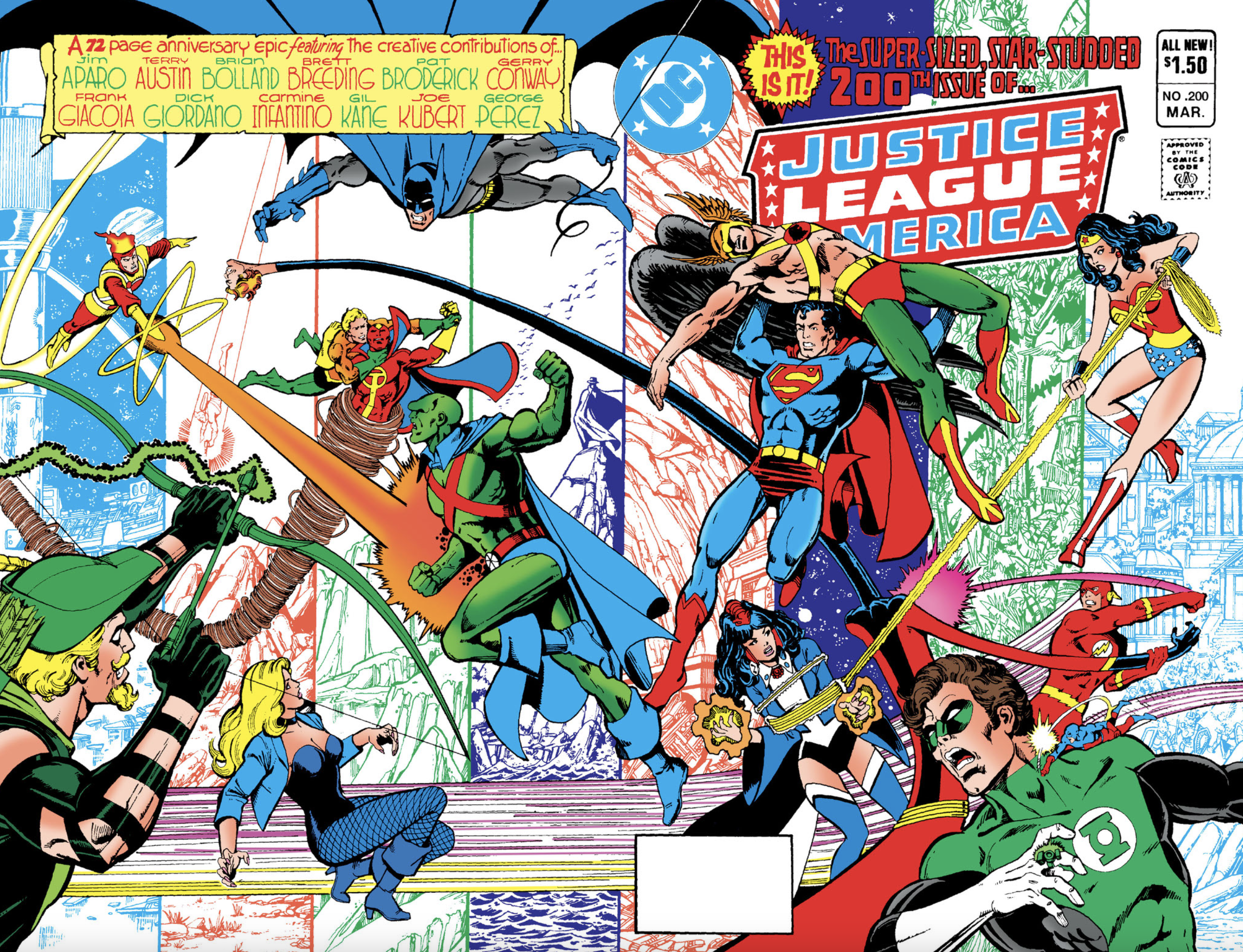 (The artists include, among others, George Perez, Jim Aparo, Terry Austin, Brian Bolland, Brett Breeding, Pat Broderick, Frank Giacoia, Dick Giordano, Carmine Infantino, Gil Kane, and Joe Kubert.)