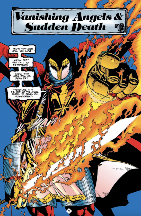 The story opens with Azrael looking for all the world like an avenging angel of justice, being shot multiple times as he tries to eliminate a crime boss. It turns out, though, that he’s just a man, whose name and purpose stretch back to the 14th century. His son, cradling his dying father in his arms, promises to learn to be Azrael as his father did.