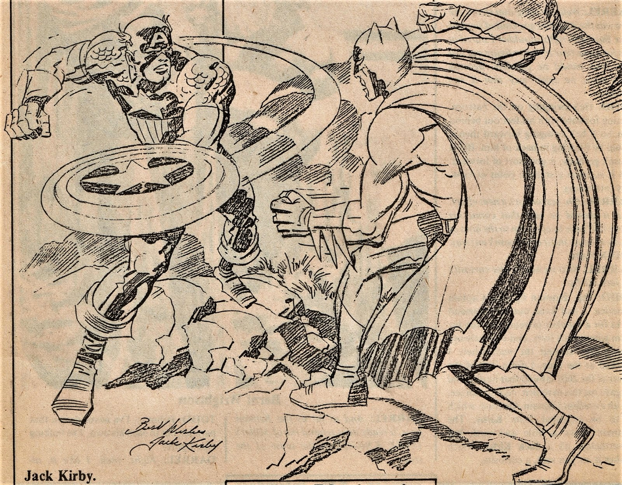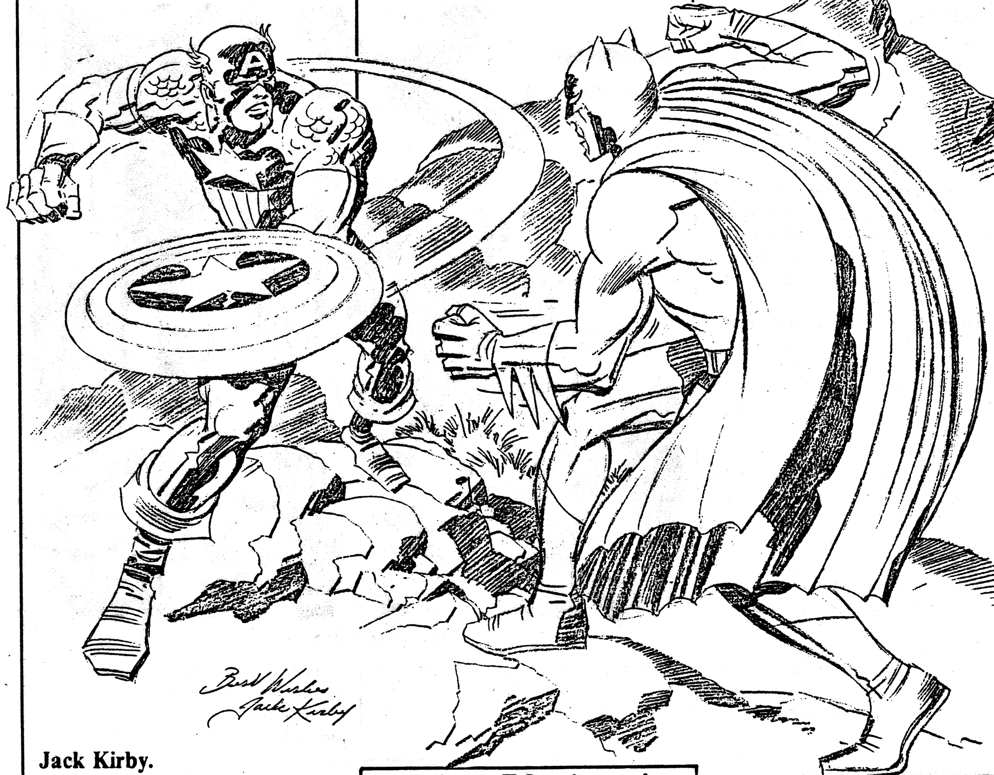 In my travels across the internet, I stumbled across this kinetic Jack “King” Kirby drawing of Captain America taking on Gotham’s Caped Crusader, the Batman! The aging newsprint makes it appear to be from either Comics Buyer’s Guide, The Comic Reader or perhaps Amazing Heroes. (You tell me!)