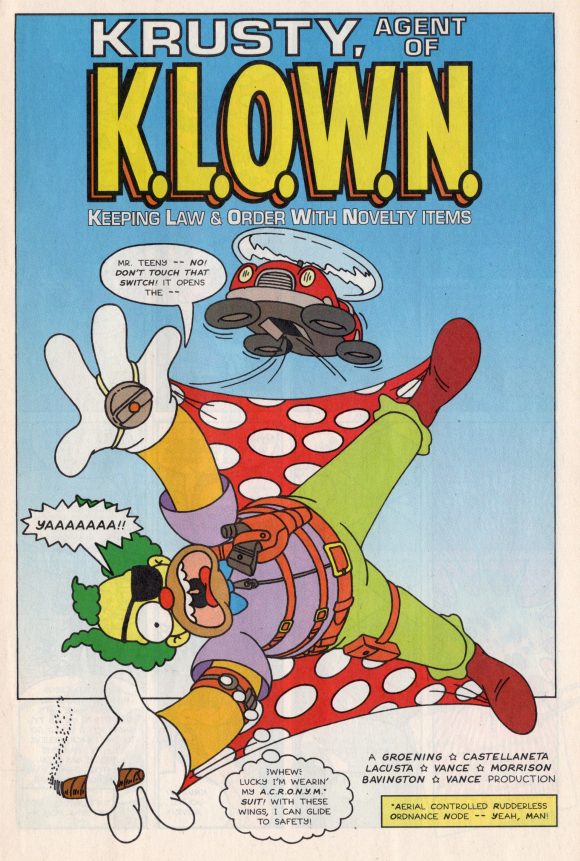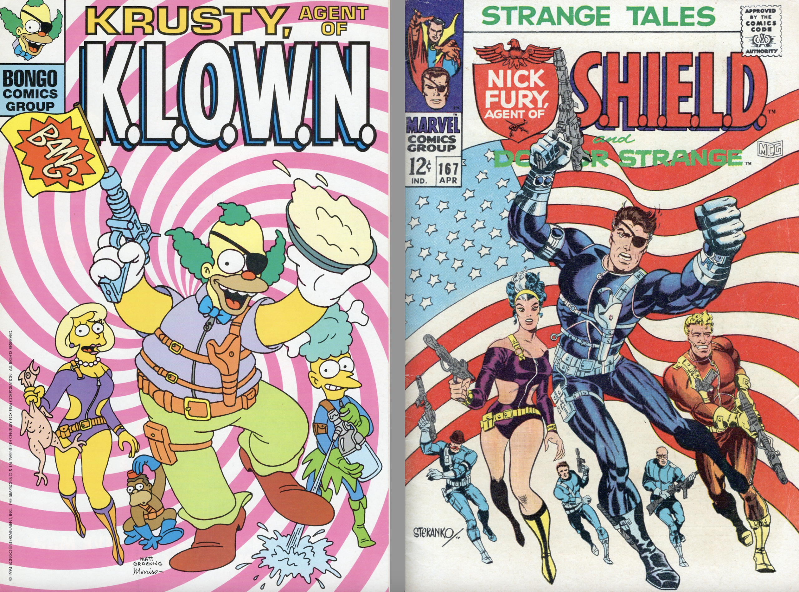 In the early days of Bongo Comics, we featured secondary Simpsons characters in their own short backup stories, while also parodying our favorite genres of the comics we grew up reading. It was Steranko’s version of Nick Fury, Agent of S.H.I.E.L.D. that inspired Steve Vance, along with the voice of Homer Simpson and Krusty the Clown, Dan Castellaneta, and Simpsons TV series writer, Deb Lacusta, to pen the brilliant parody, Krusty, Agent of K.L.O.W.N. (Keeping Law & Order With Novelty Items… don’t ask me what happened to the I) in Simpsons Comics #3.