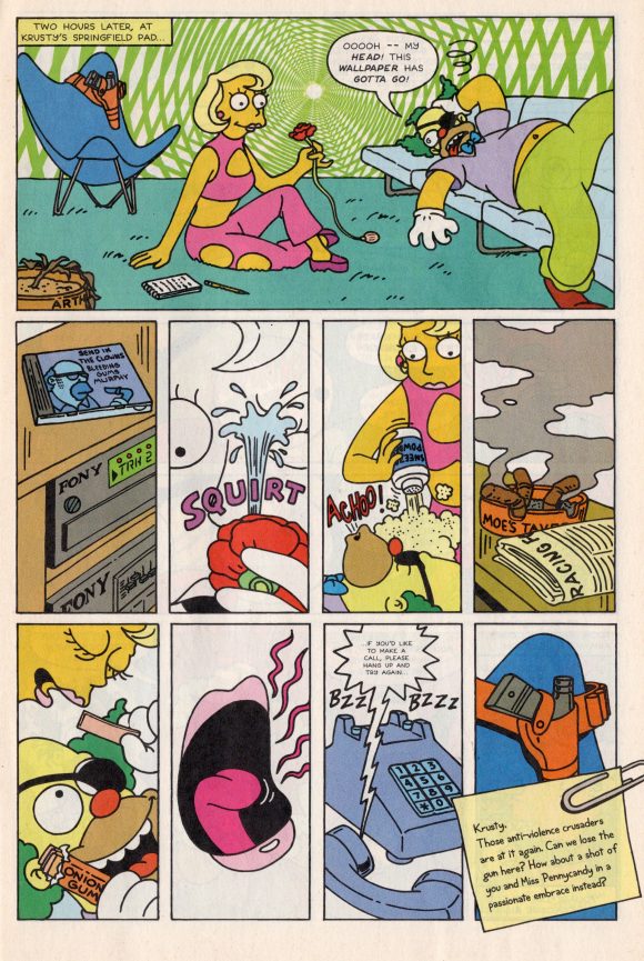 For those who want to look for a copy of Simpsons Comics #3 to read the whole story, I offer a caveat. There is a very pricey version of this issue known as the “Bart Code” edition. It has a portion of Bart Simpson’s head in the box where the barcode usually is on newsstand editions. Copies of that version can go for as much as $500, so if you look for the book online and they’re asking hundreds of dollars, don’t be dismayed: A regular edition can be found for a few bucks!